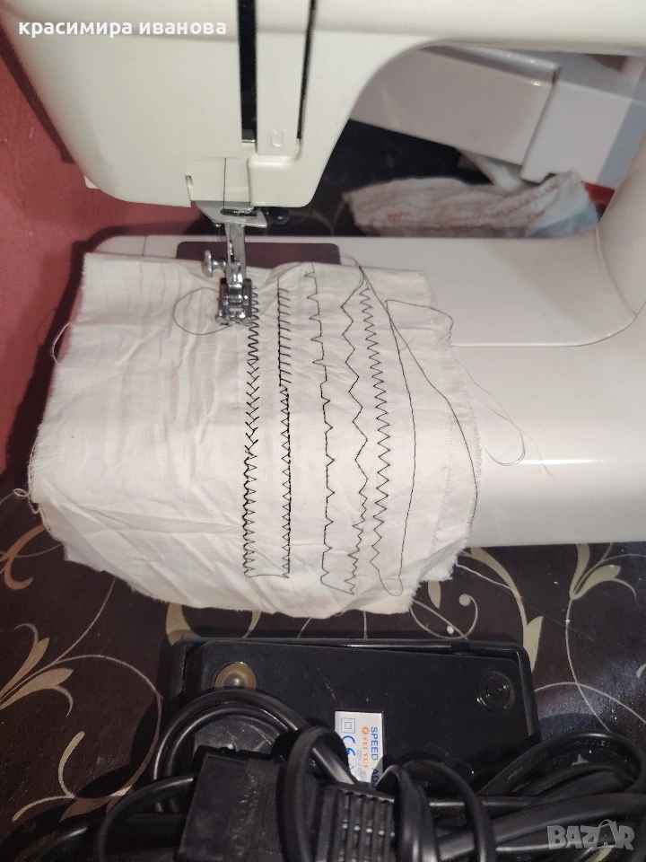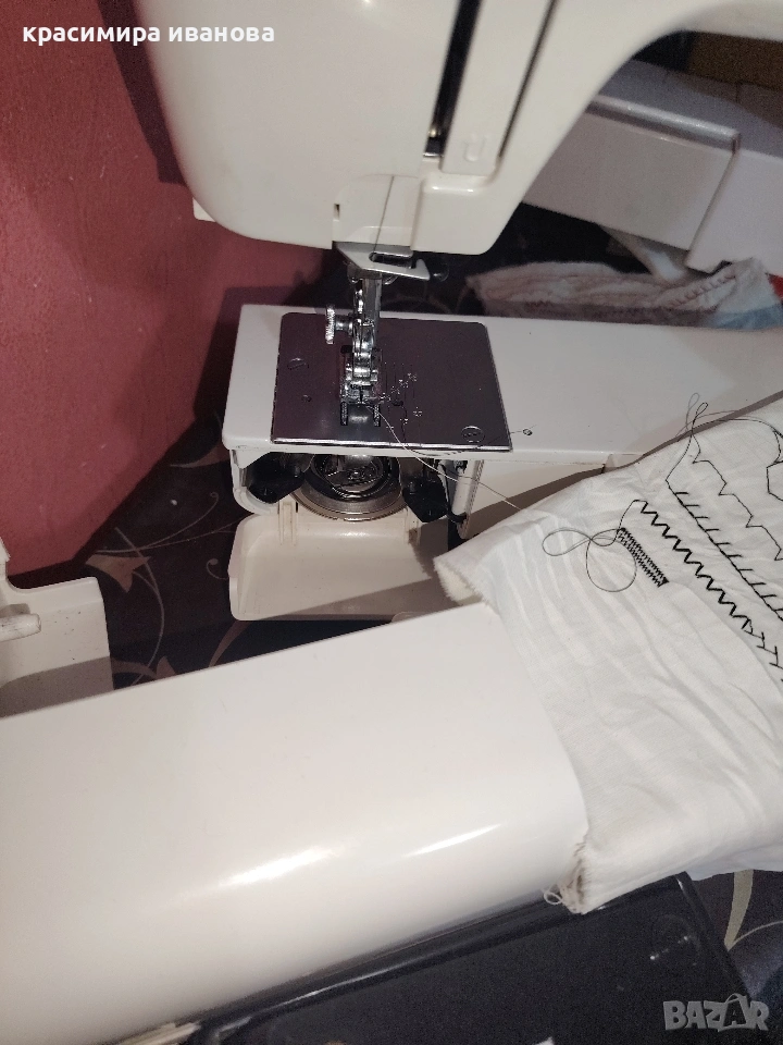 Машината е в отлично състояние с метален корпус и механика много плавна при работа шие дънки без проблем