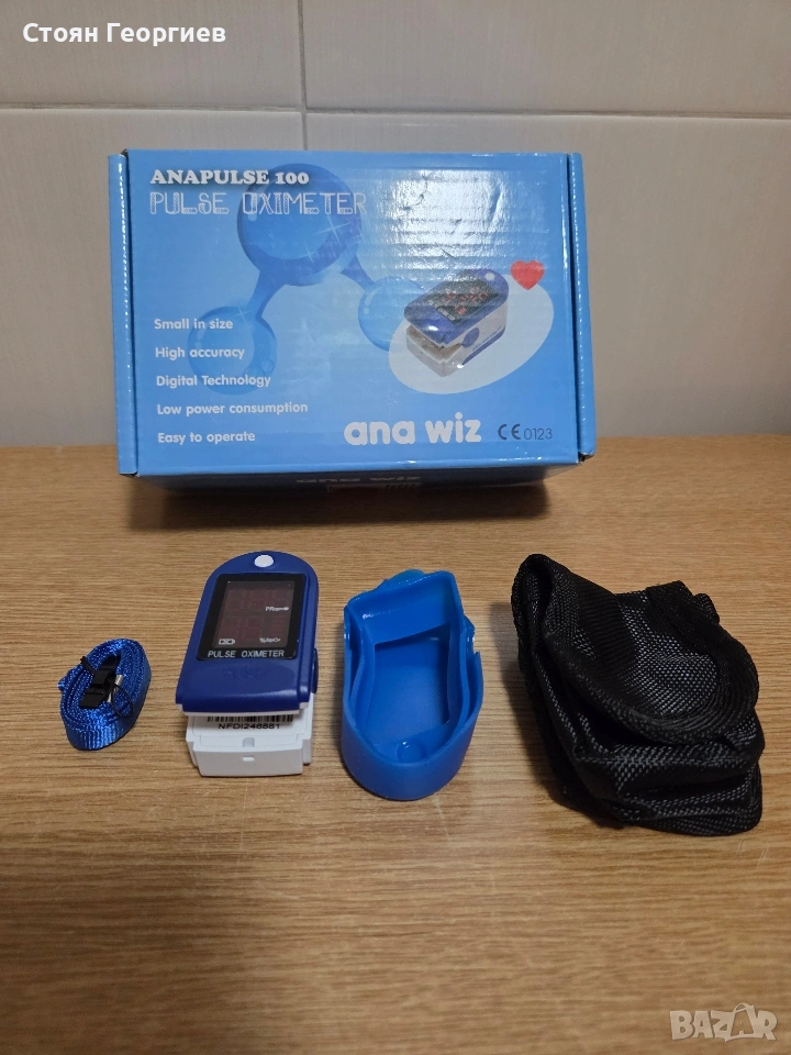 Пулсов оксиметър Anapulse 100. Това е пръстов пулсов оксиметър, който измерва SpO2 (насищане с кислород) и пулса. Устройството е леко и малко, предназначено за лесна преносимост. Той е CE сертифициран, което означава, че отговаря на изискванията за медицинска безопасност на Обединеното кралство и ЕО. Пулсовата оксиметрия е безболезнен метод за измерване на нивото на кислород в кръвта.