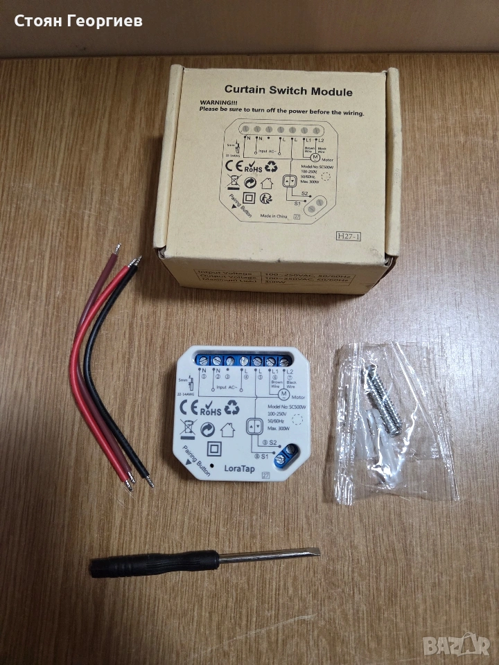 Модул за превключвател за завеси LoraTap SC500W. Това е интелигентен превключвател, предназначен за управление на моторизирани завеси, ролетни щори и сенници. Устройството е съвместимо с повечето електрически двигатели за завеси и изисква четирижилно свързване, включително нулев проводник. Моделът работи с напрежение от 100-250V и поддържа максимална мощност от 300W. Може да се управлява чрез приложението Tuya Smart Life, гласови асистенти като Amazon Alexa и Google Home, или чрез ръчен стенен превключвател.