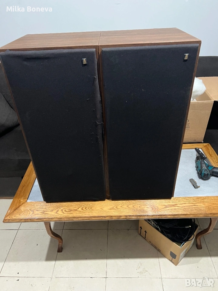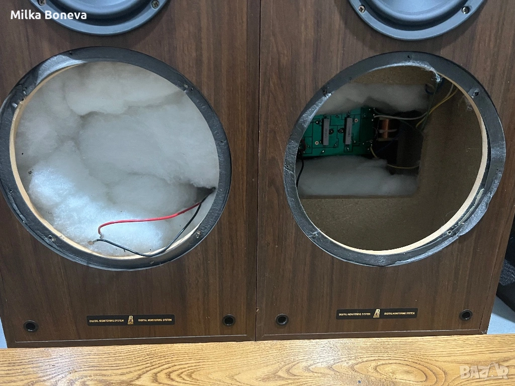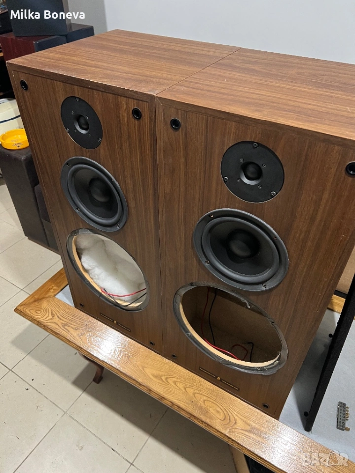 Колоните са в много добро състояние, липсват басовите говорители. Пищялките са AR, на средночестотните говорители няма маркировка.