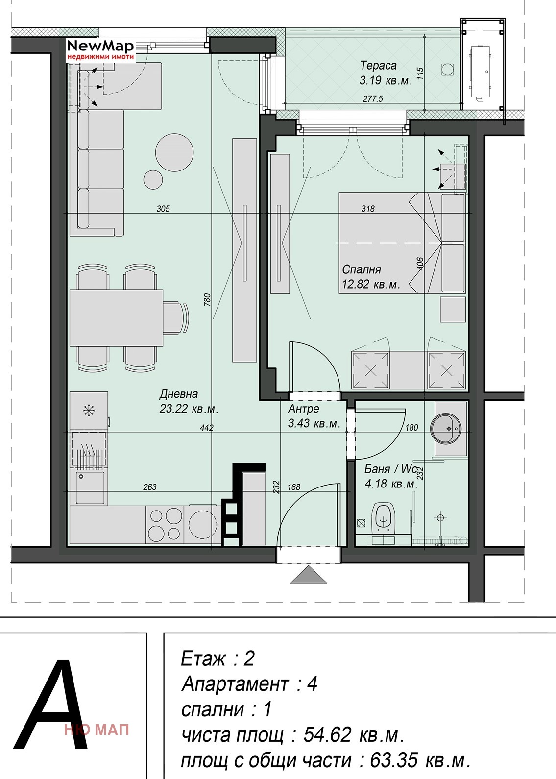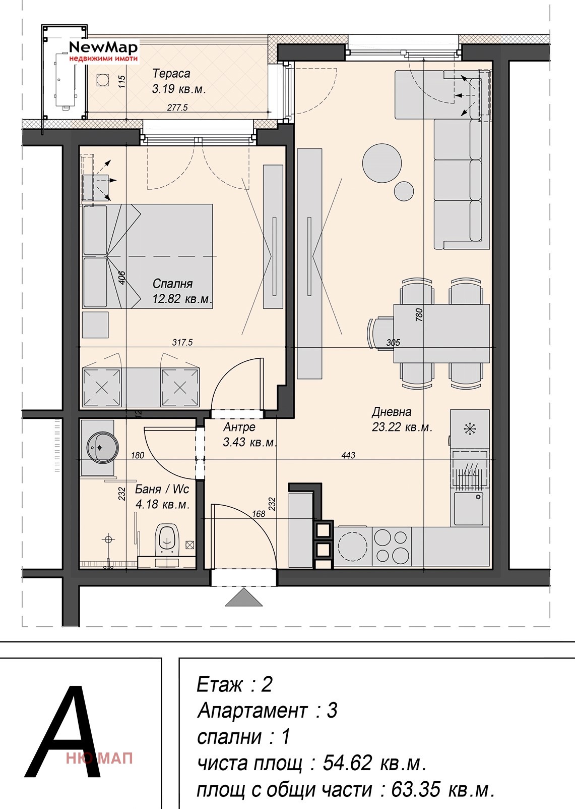 Апартамент с просторна дневна с кухненски възел, една спалня, баня с тоалетна и тераса. Чиста площ на апартамента от 55 кв.м.
