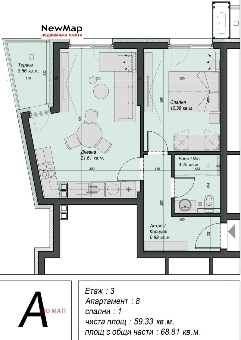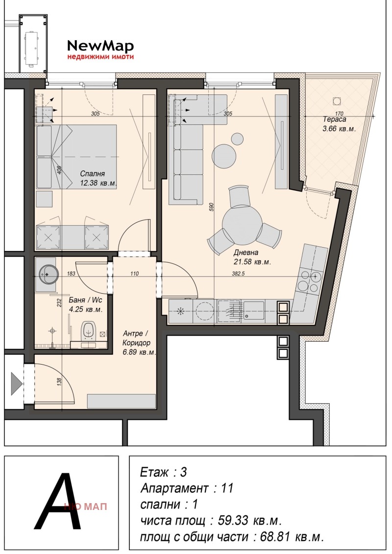 Апартамент с просторна дневна с кухненски възел, една спалня, баня с тоалетна и тераса. Чиста площ на апартамента от 59,33 кв.м.