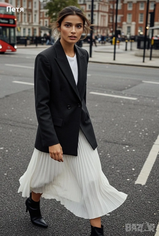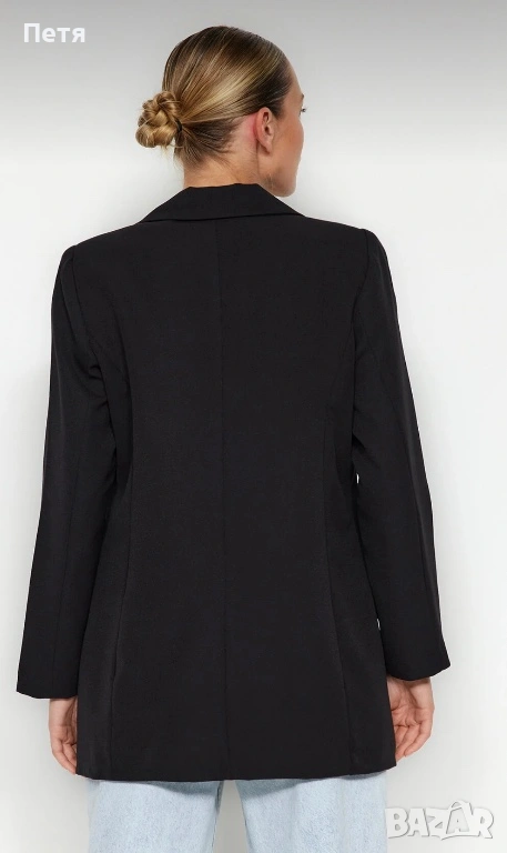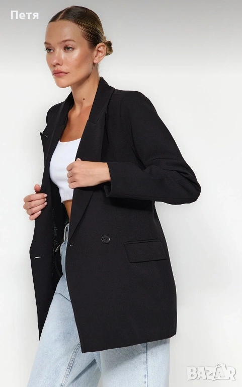 Елегантен черен блейзър с изчистена линия и леко свободна кройка, която придава effortless chic визия. Моделът е с класическа яка, двойно закопчаване и структурирани рамене – перфектен както за офис визия, така и за ежедневен градски стил. Лесно се комбинира с рокли, поли, дънки или панталони и добавя завършен, стилен акцент към всеки аутфит.