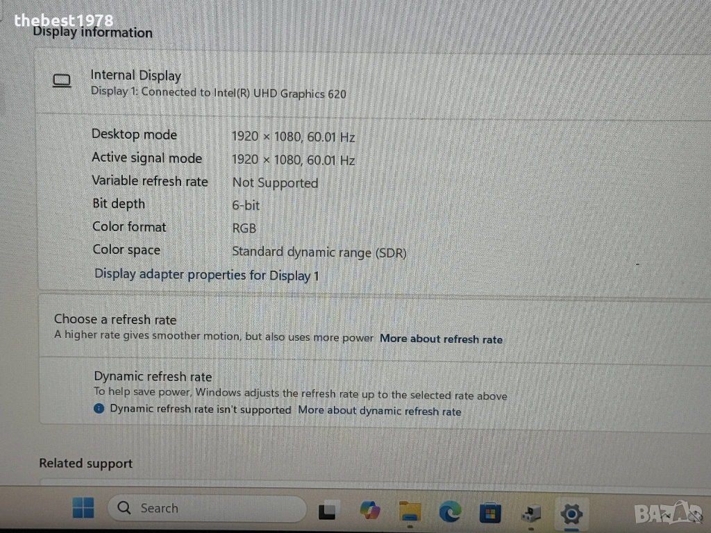 Видео карта Intel UHD Graphics 620 (споделена памет)