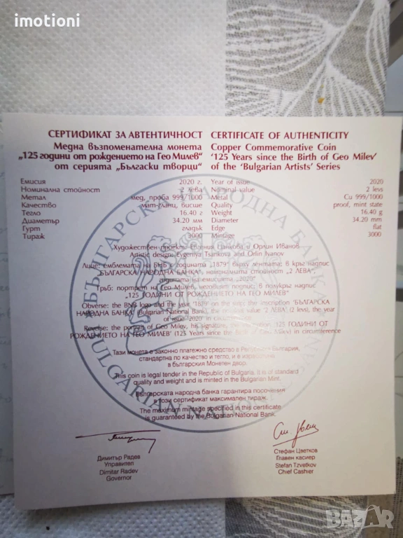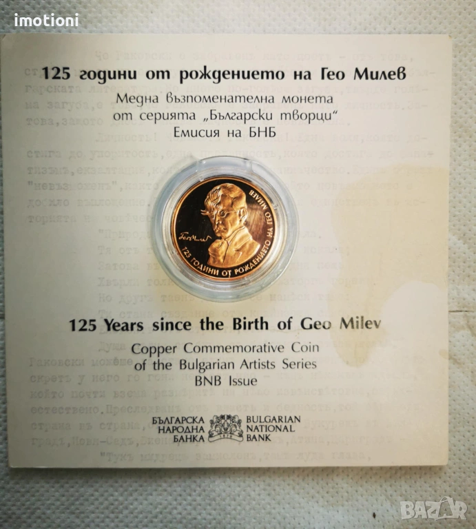 Предлагам ви една възпоменателна монета от 2 лева 2020 година на БНБ по случай „125 години от рождението на Гео Милев“ в брошура със сертификат.