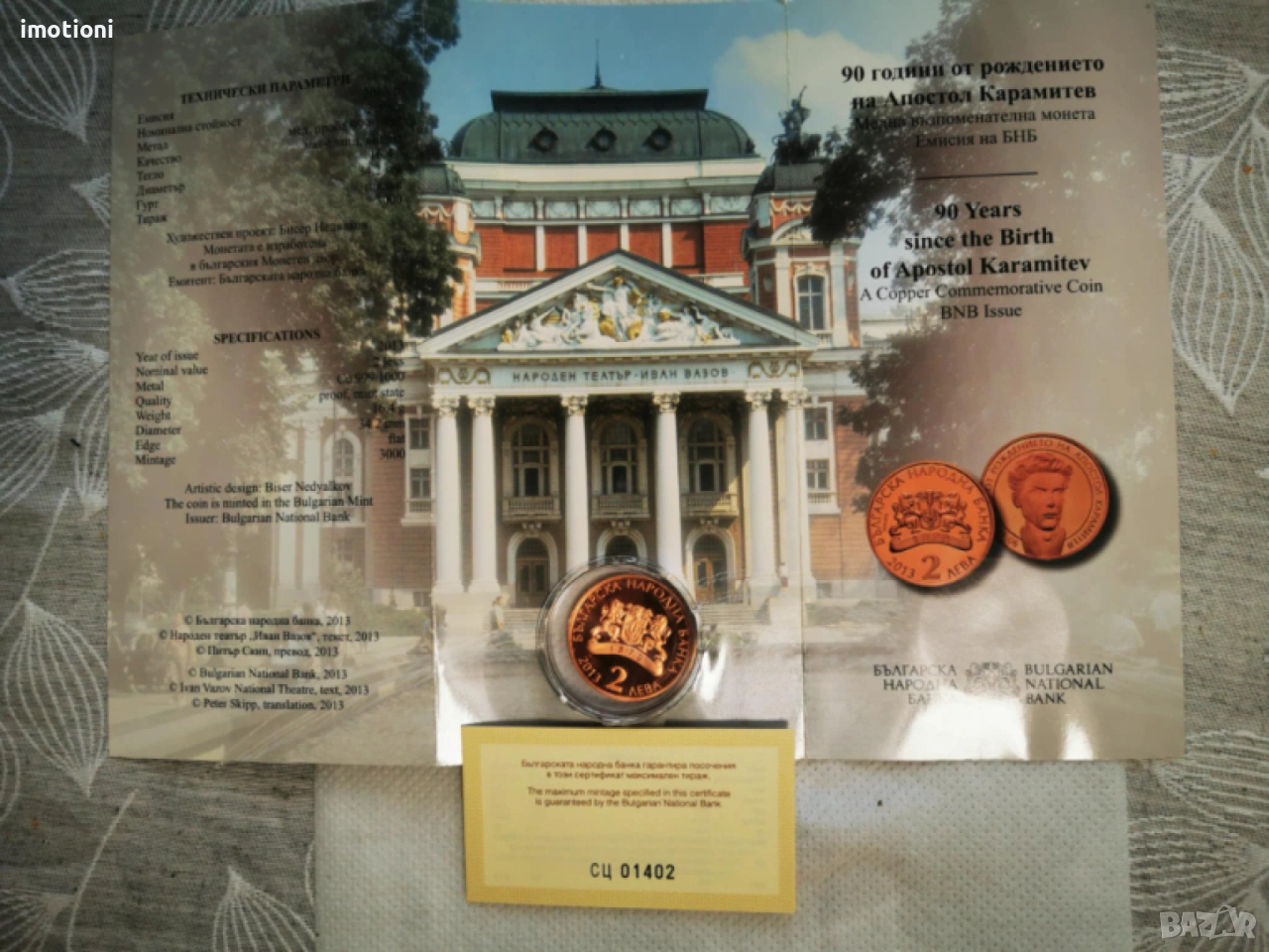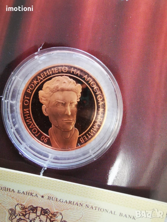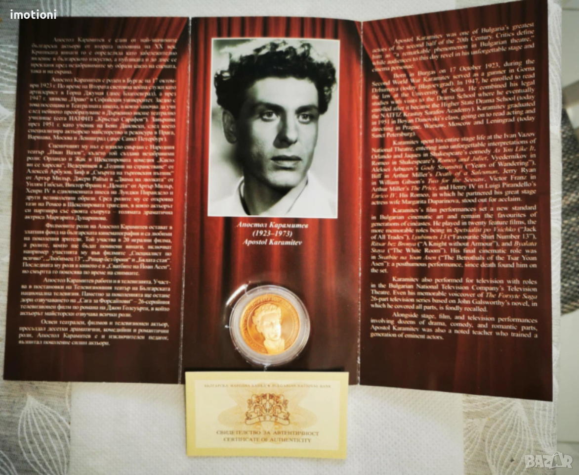 Предлагам Ви една възпоменателна монета от 2 лева 2013 година послучай „90 години от рождението на Апостол Карамитев“в брошура и със сертификат.По монетата/на косата/ има малко черно петно.