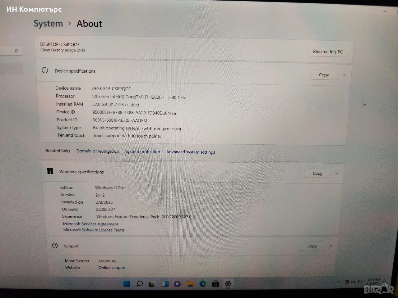 Лаптопа е включен от нас за първи път и е инсталиран с Windows 11. Налични два броя.