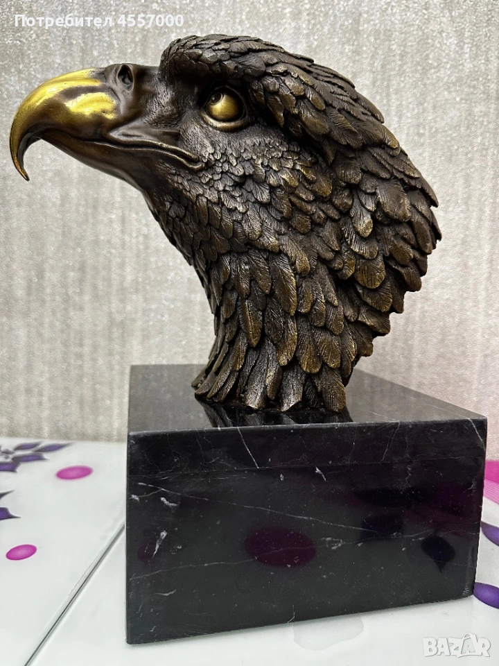 Продавам изключително детайлна и величествена скулптура на орел, изработена от истински бронз върху масивна мраморна основа. Статуетката се отличава с прецизна изработка на всяко перо и ефектен златист финиш на клюна, което ѝ придава луксозен вид.