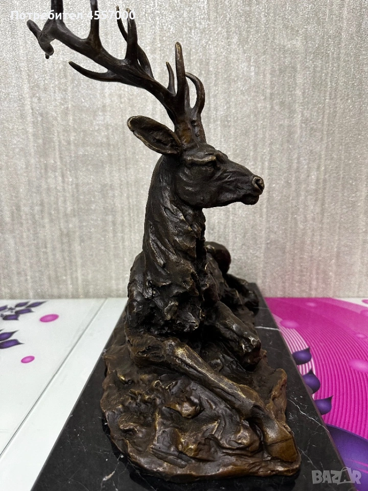 Продавам изключително красива, голяма и тежка бронзова скулптура на благороден елен. Фигурата се отличава с реалистични детайли на рогата и тялото, поставена върху солиден мраморен постамент. Изключително масивен предмет, подходящ за престижен подарък или интериорен акцент.