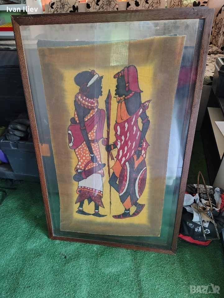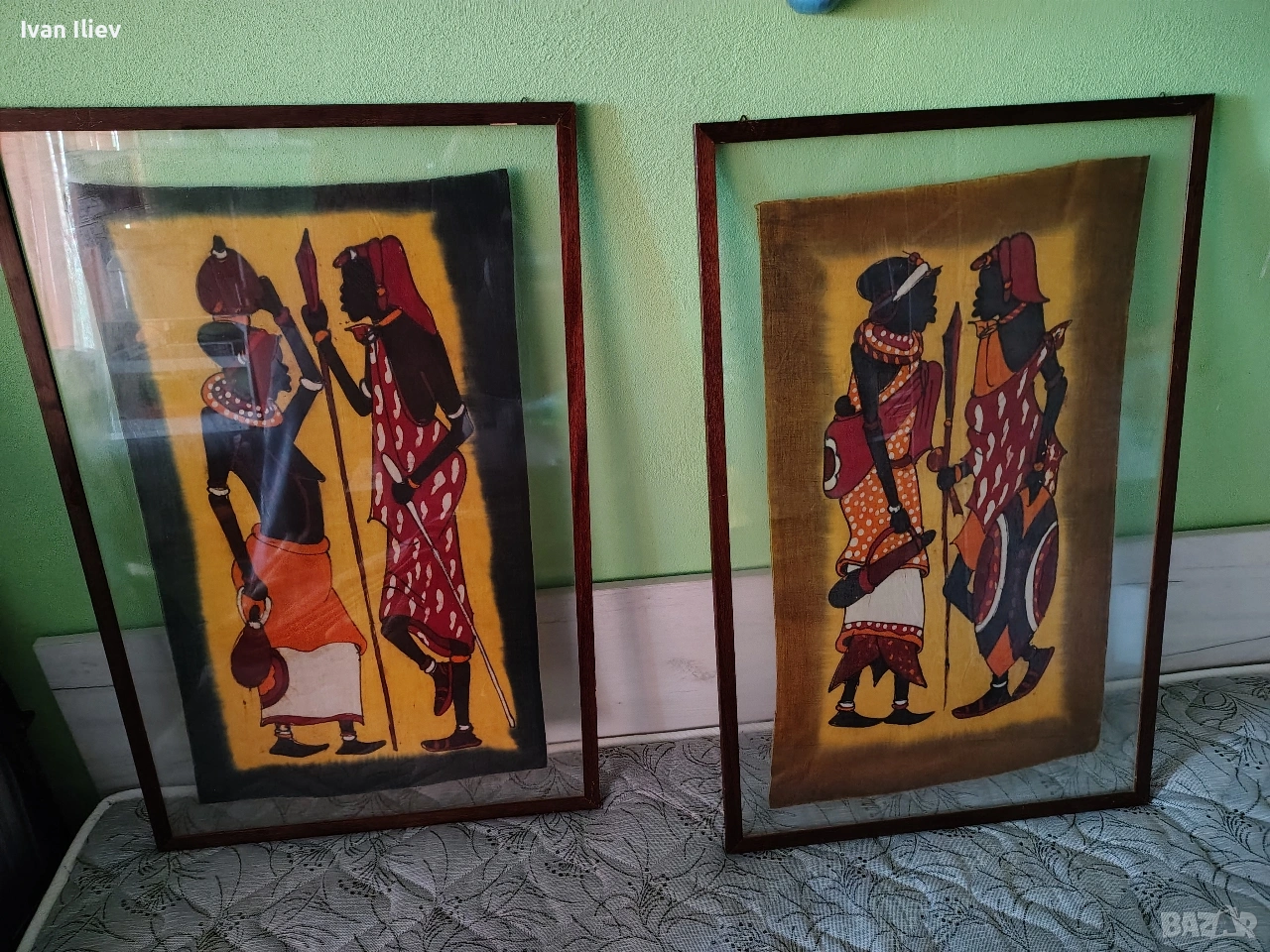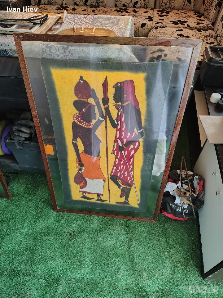 Това са африкански картини, изпълнени в техниката батик. Този стил на изкуство произхожда от Източна Африка, особено Кения и Танзания. Техника: Батикът е традиционна техника на восъчна резистентност при боядисване на плат. Върху памучен плат се нанася горещ течен восък в определен дизайн; платът след това се потапя в боя, която оцветява само неосвободените от восък зони. Този процес се повтаря за всеки използван цвят. Картините често изобразяват сцени от племенния живот, като фигури на хора от племето Масаи. Изобразени са хора, носещи традиционни дрехи, бижута и копия. Размерите съм ги снимал! Който има интерес да пише или звъни!