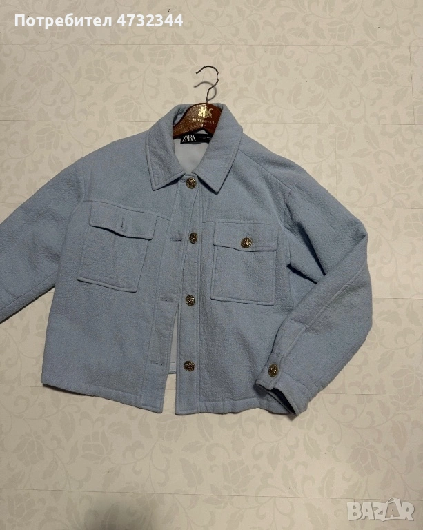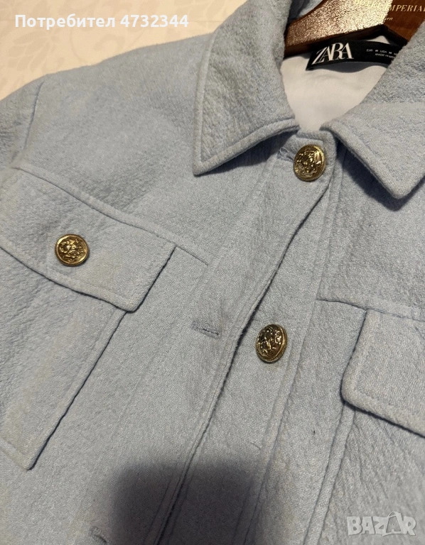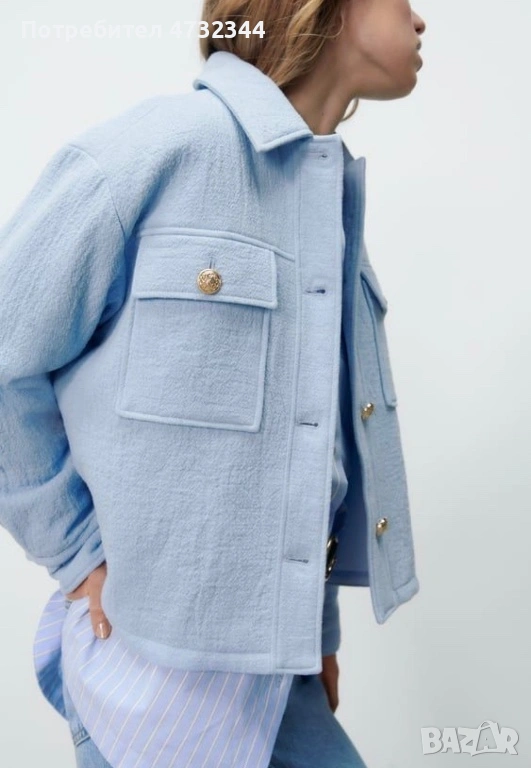 Светлосиньо яке ZARA, модел недостъпен в България, купувано от Париж. Якето е в размер М но става и за хората които носят размер С.Свободна кройка, мека и комфортна материя, големи предни джобове и златисти копчета за ефектен завършек. Якето е в отлично състояние и стои модерно и стилно — перфектно за пролет и есен.