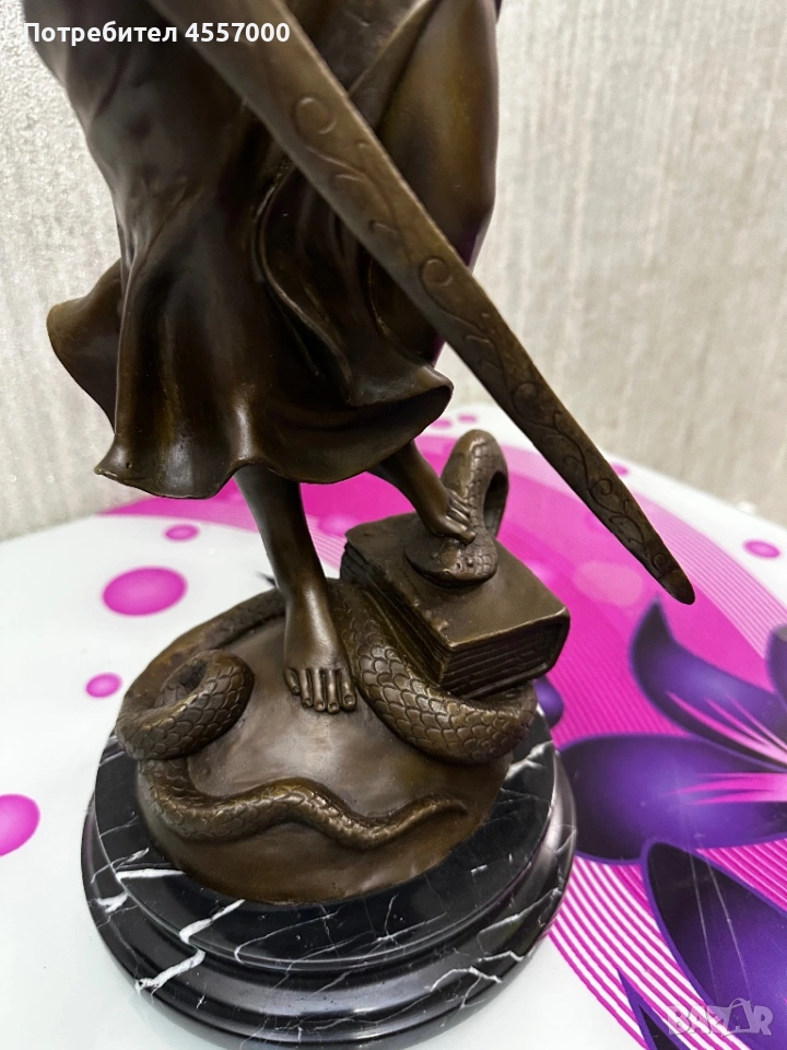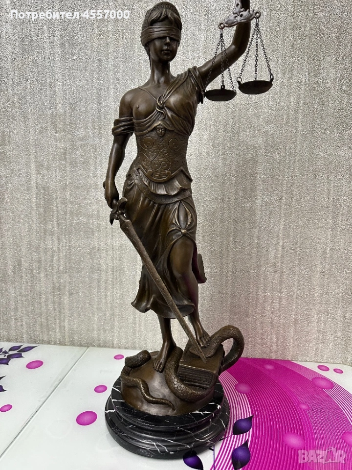 Продавам внушителна и детайлна бронзова статуетка на Богинята на правосъдието – Темида. Това е голям „Гранд“ модел, който се отличава с височина от близо 60 см и масивна изработка. Статуетката е монтирана върху стабилен постамент от черен мрамор. Изключително подходяща за престижен подарък или декорация на адвокатски и нотариални кантори.