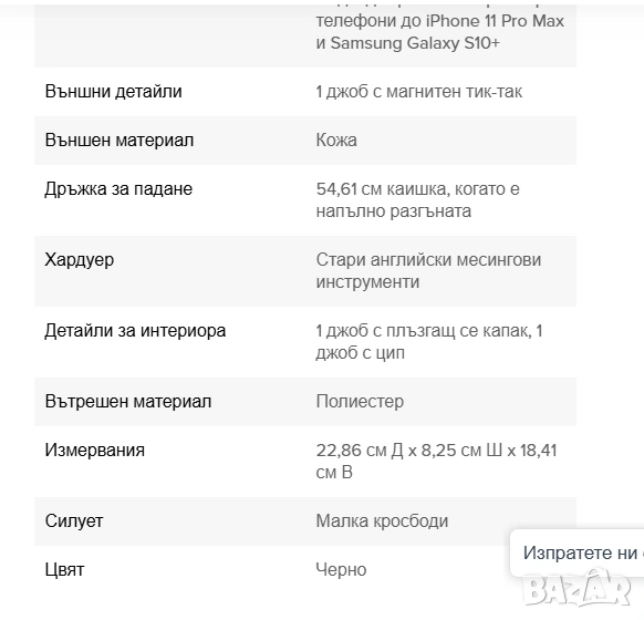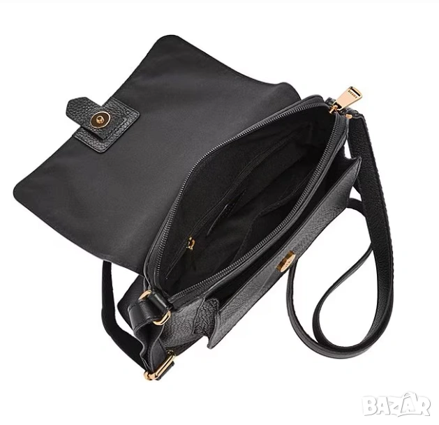 - Дизайн: Чантата е с капак и скрито магнитно закопчаване, както и основно отделение с цип.