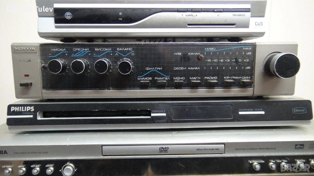 Продавам двд видео сд усилвател и някаква уредба .Всичките неща от снимката за 50 евро.Уредбата е изпускана и не работи .Едното видео работи другото не е пробвано.Усилвателя работи само единия канал.ДВД плеярите не са пробвани може и да не работят.