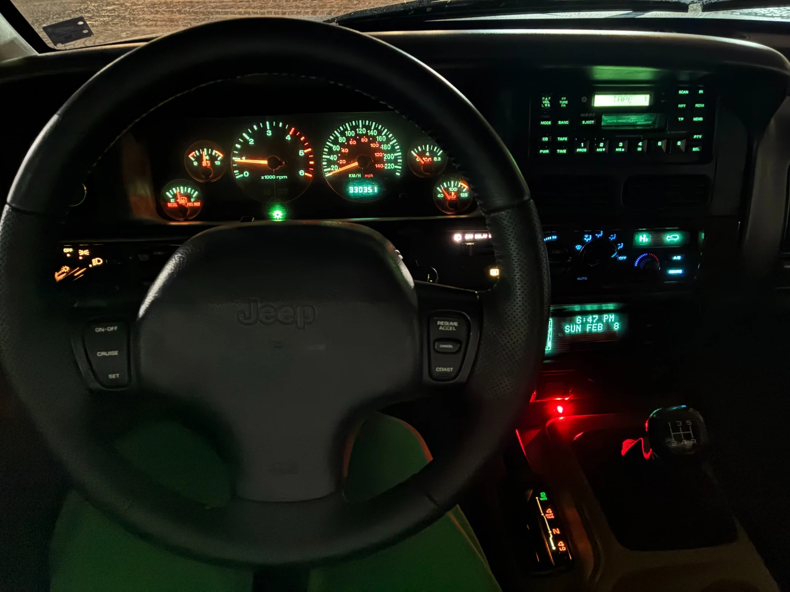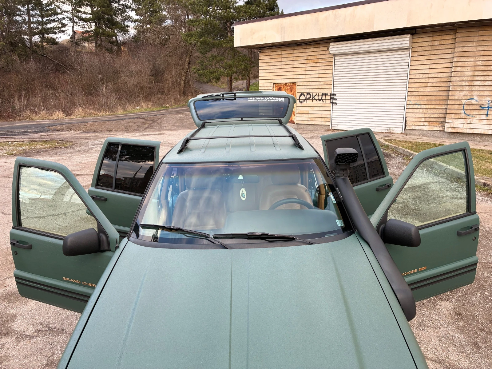 Джипа не е бит в гората и е в добро здраве. Няма ръжда, гнило и т. н. Двигателя е с ангренаж на зъбни колела и няма ремъци/вериги. Заводски излиза с раздатка NP231 - има възможност да се кара само на задно предаване. Чисто нови гуми Toyo Open Country AT3 с размер 235/75/15 (купувани 2026-та година). Добра резервна гума със същия размер. Пали и върви много приятно без абсолютно никакви пушеци. Климатика работи адекватно. Темпомата работи коректно. Електрохроматично (самозатъмняващо се) огледало за задно виждане. 4 ел. стъкла. Ел. огледала. Ел. кожен салон с надув на лумбалната опора на двете предни седалки. Предни къпхолдери. Задни къпхолдери. Напълно функционални компас и датчик за външна температура. Дава се с трите ключа. Бързи/бавни скорости работят перфектно. Ключови подобрения, извършени през последните няколко години: Повдигнат с 5см подложки отпред и отзад. Цялостно пребоядисан с боя Кобра. Обезшумени врати с шумо и вибро изолация. Нов ЛЕД бар. Монтиран шнорхел специално за модела, свързан с въздушната кутия и напълно функционален. Манипулациите, извършени по Черокито през 2025-та година са: Сменени двата задни колесни лагера. Сменен семеринг на задния диференциал откъм кардана. Сменени предни и задни накладки. Сменени накладки на ръчната. Сменени 4-те подгревни свещи. Сменена водна помпа. Сменен виско съединител. Сменен пистов ремък. Сменени маркучи за обратната нафта. Автомобила се обслужва със следните течности: Масло двигател - Motul 8100 X-Cess 5w40. Масло скорости - Motul Motylgear 75w90. Преден мост - Mopar Gear & Axle 80w90. Заден мост - Mopar MS-8985 75w140 GL5 + добавката на Mopar 4318060AD за LSD. Хидравлика на кормилна уредба - Mopar PSF+4 (MS-9602). Подробни технически спецификации на джипката: Ръчна скоростна кутия - AX-15 Раздатка - NP231 Преден мост - DANA 30 Заден мост - DANA 35 LSD Колата се кара ежедневно и нощува в гараж. Огледи са възможни в София, Перник и Кюстендил. Платен данък за цялата 2026г. и валиден ГТП до 02. 2027г. Оставам на разположение по телефона при нужда от повече снимки, задаване на въпроси, информация за екстри, ремонти, обслужване и т. н.