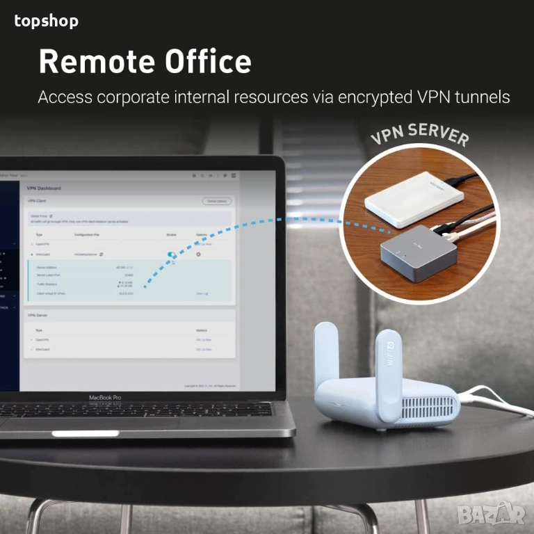 Хардуерен VPN: Преинсталирани OpenVPN и WireGuard. Поддържа над 30 VPN доставчика.