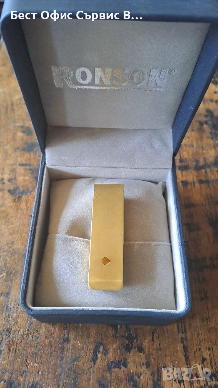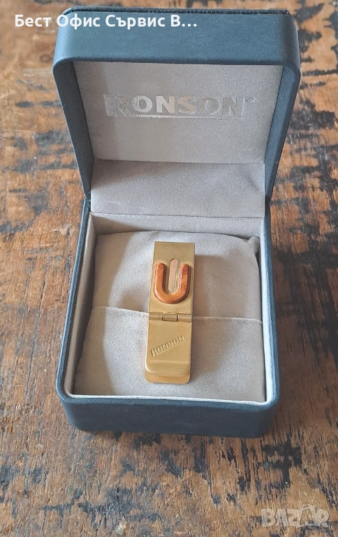 Продавам щипка за пари Ronson позлатена матова масивна с дизайнерска декорация, имитация на кафяв ахат, в подаръчна кутия, Размер на щипката за пари е 6,5x1,9x0,9 см. В оригиналната си кутия Ronson с размери 8,5x10x5,8 см. Много рядка и уникална. От частна колекция. За ценители.