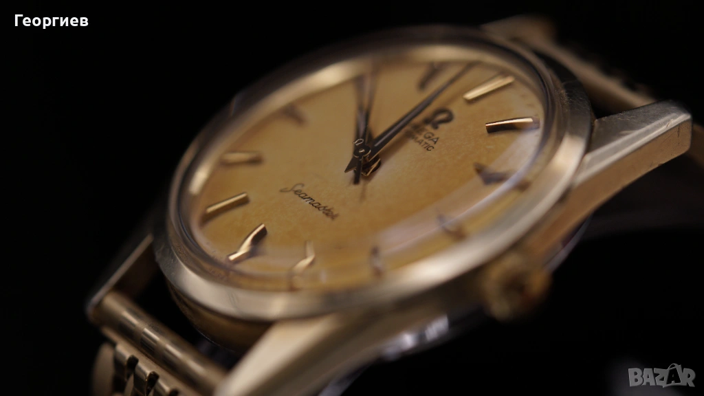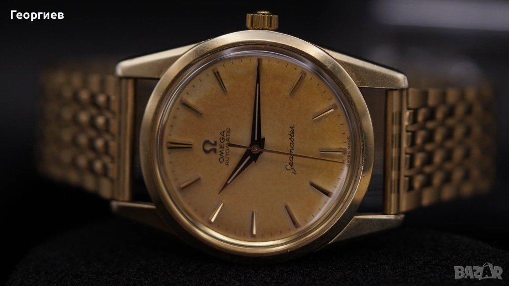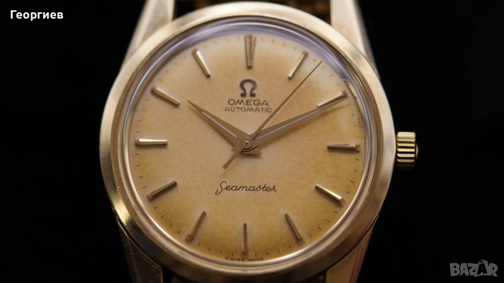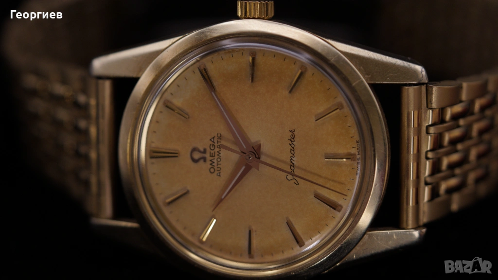 Vintage Omega Seamaster Automatic, референция 14700-4 SC, произведен през 1962 г., с автоматичен механизъм Omega caliber 552 – един от най-надеждните и търсени механизми на марката от периода. Часовникът е с оригинален циферблат, придобил равномерна тропикал патина, придаваща красив топъл шампанен оттенък. Печатът е ясен, индексите и стрелките са оригинални и добре запазени.