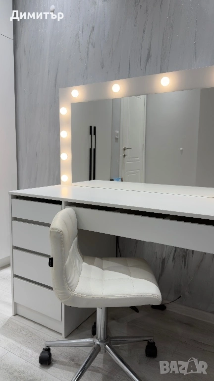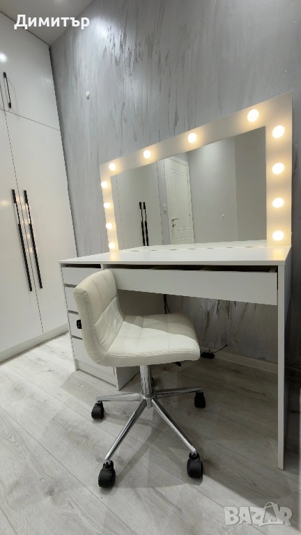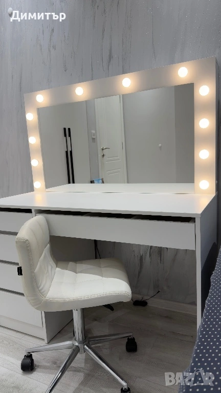Тоалетка с холивудско огледало за грим+кожен регулиращ се стол → Обява 53408384