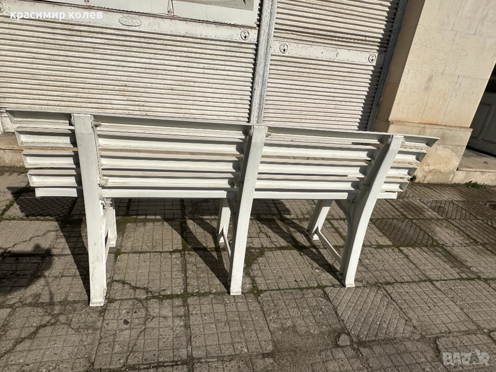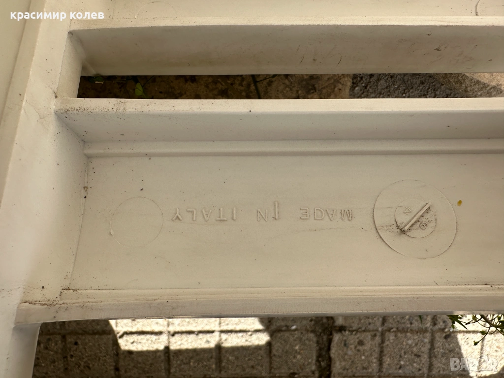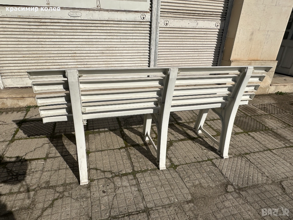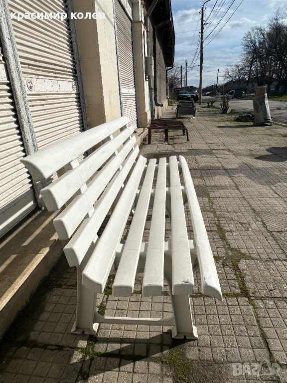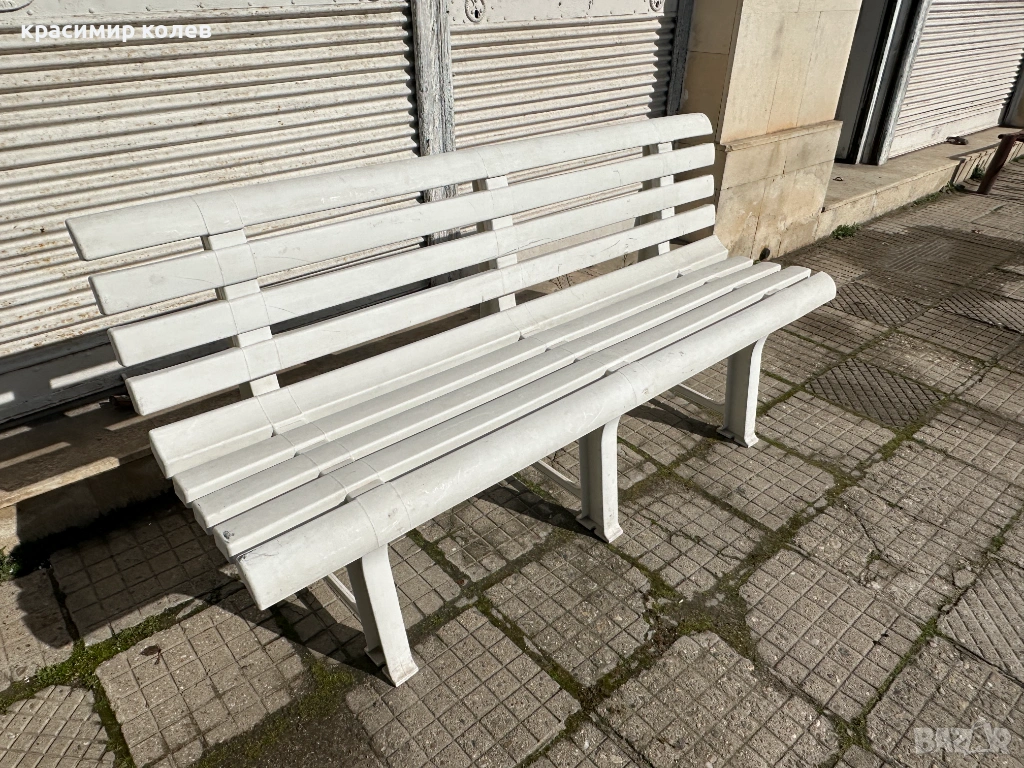 Изработена от здрава пластмаса.Има една забележка , която е снимана и не пречи да се използва по предназначение.Може да се разглоби , тъй като е на бързи връзки.Размери дължина 150 см и височина от земята до седалката 40 см.
