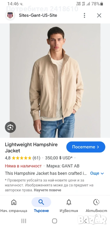Gant Light Hampshire Jacket Size 2XL НОВО ! ОРИГИНАЛ ! Мъжко преходно Яке!