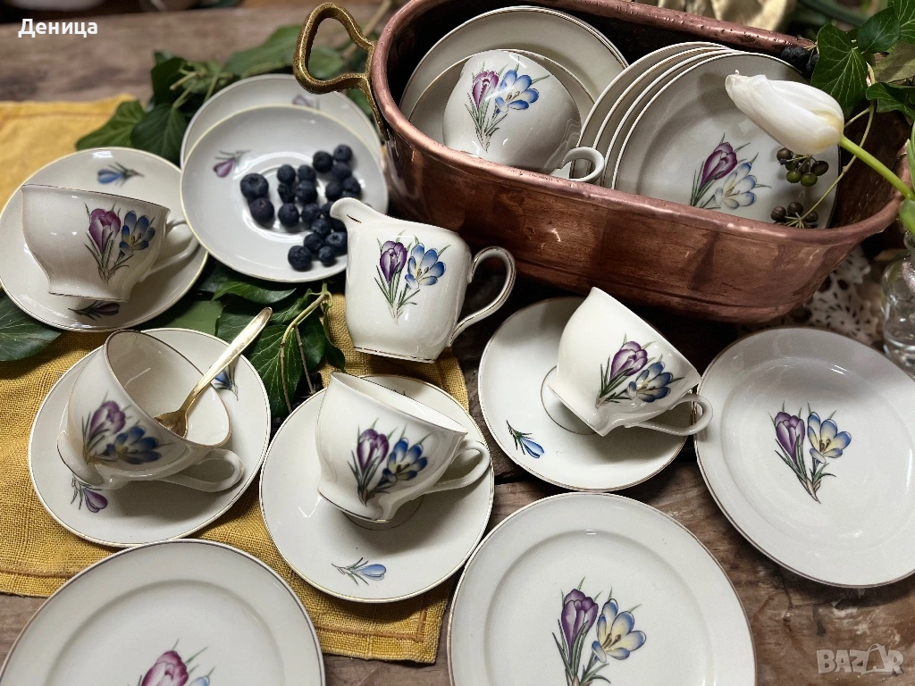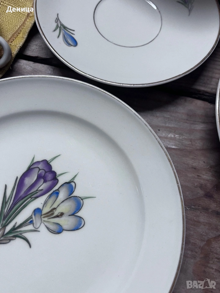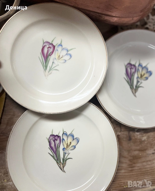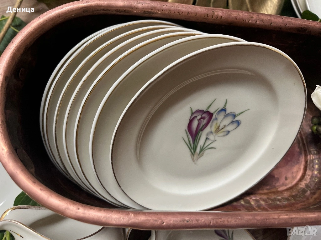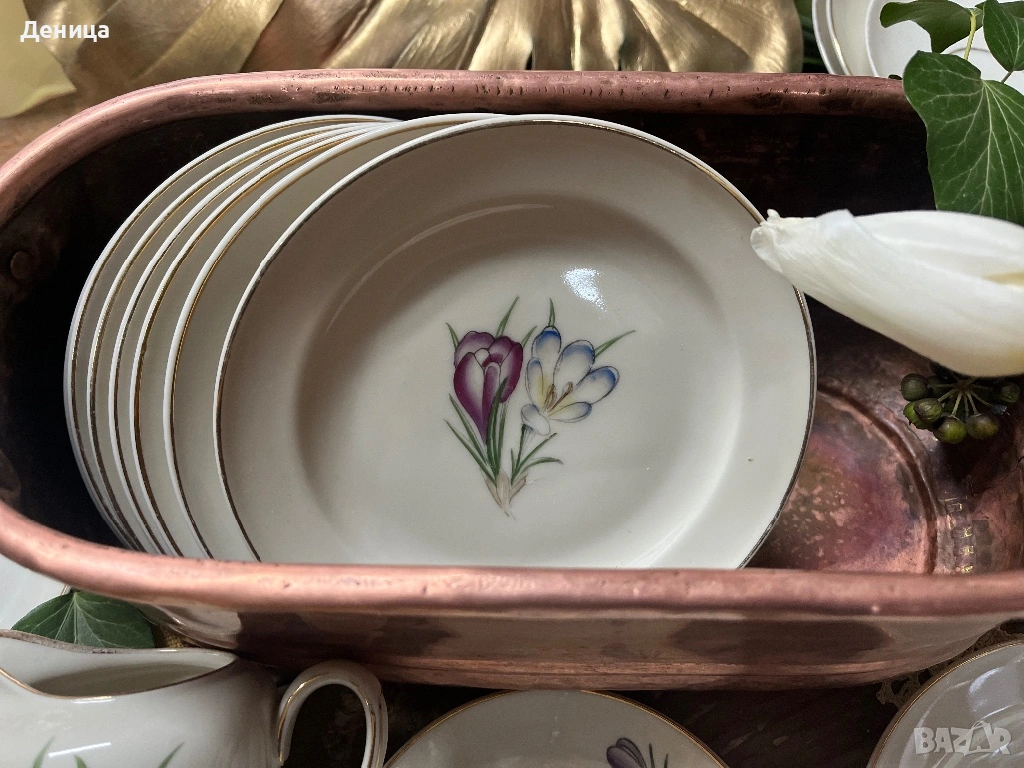 Усмихващи минзухарчета💜 Слонова кост, ръчно рисувани минзухари, златен кант ⚜️ КPM u втора маркиров → Обява 53408874