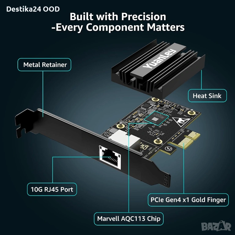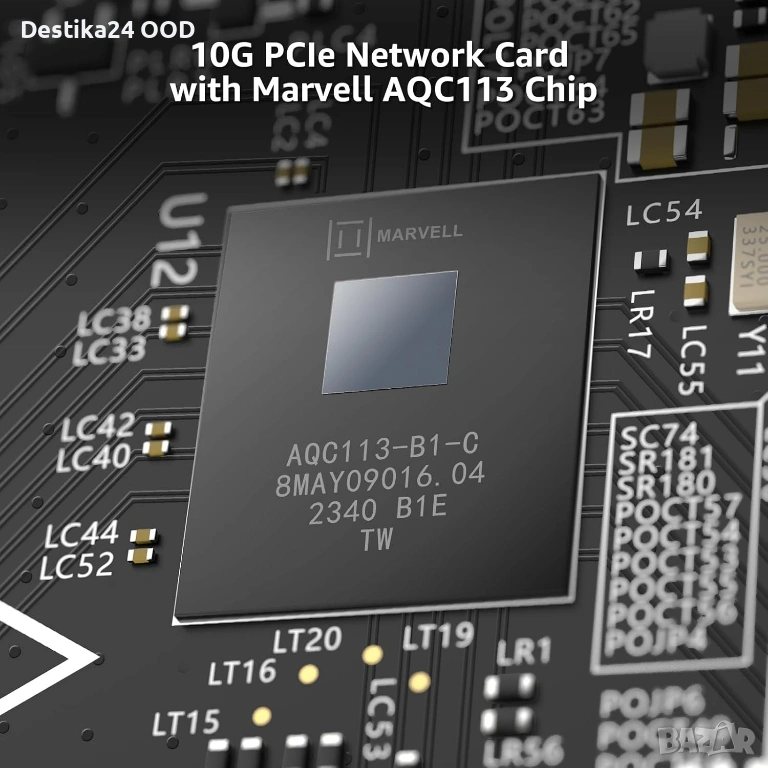 Високоскоростна 10G PCIe мрежова карта YuanLey с Marvell AQC113 контролер, предназначена за стабилна и бърза кабелна връзка до 10Gbps. Подходяща за гейминг, стрийминг, сървъри, NAS системи и работа с големи файлове.