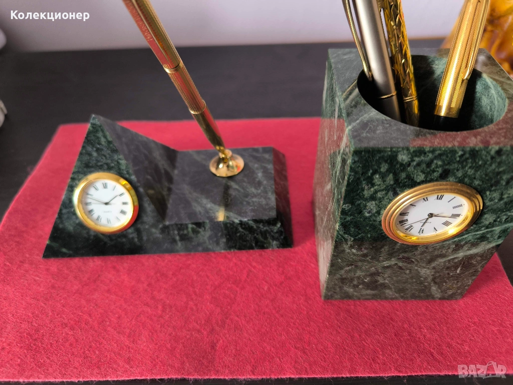 Масивен комплект за бюро от зелен мрамор. Отлично състояние. Часовниците работят.