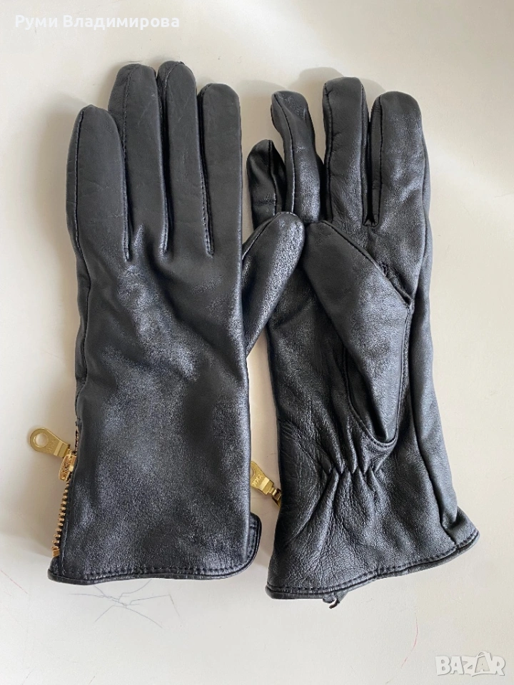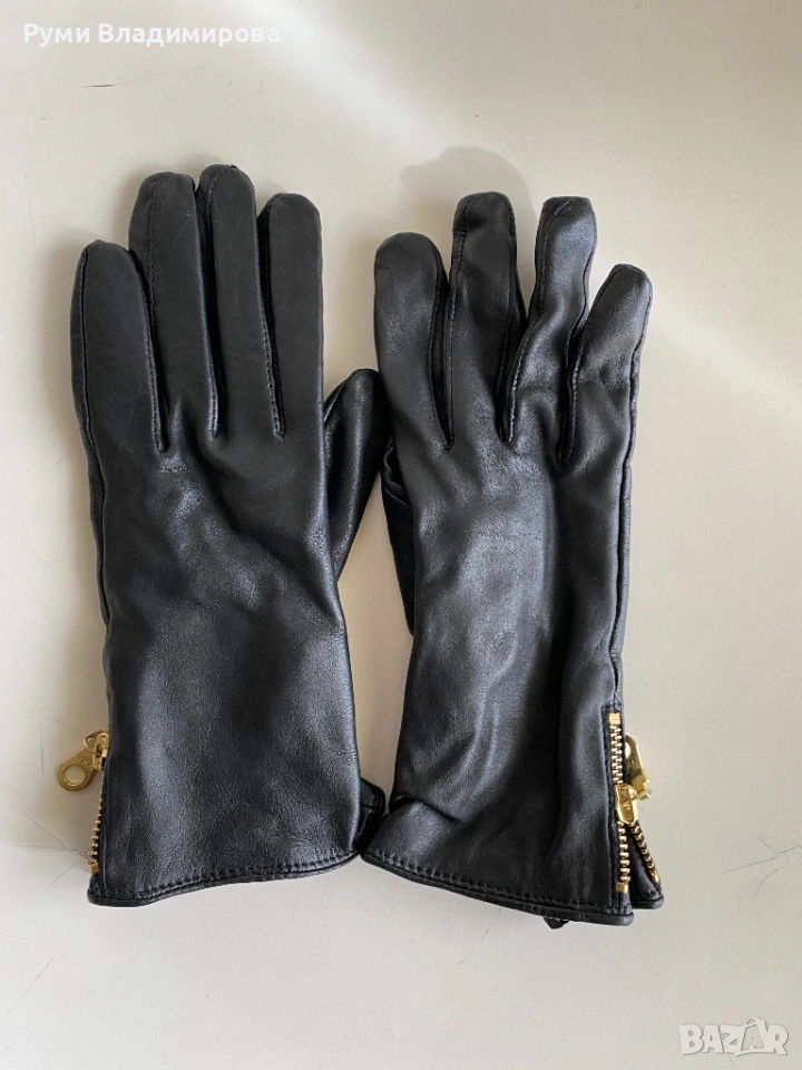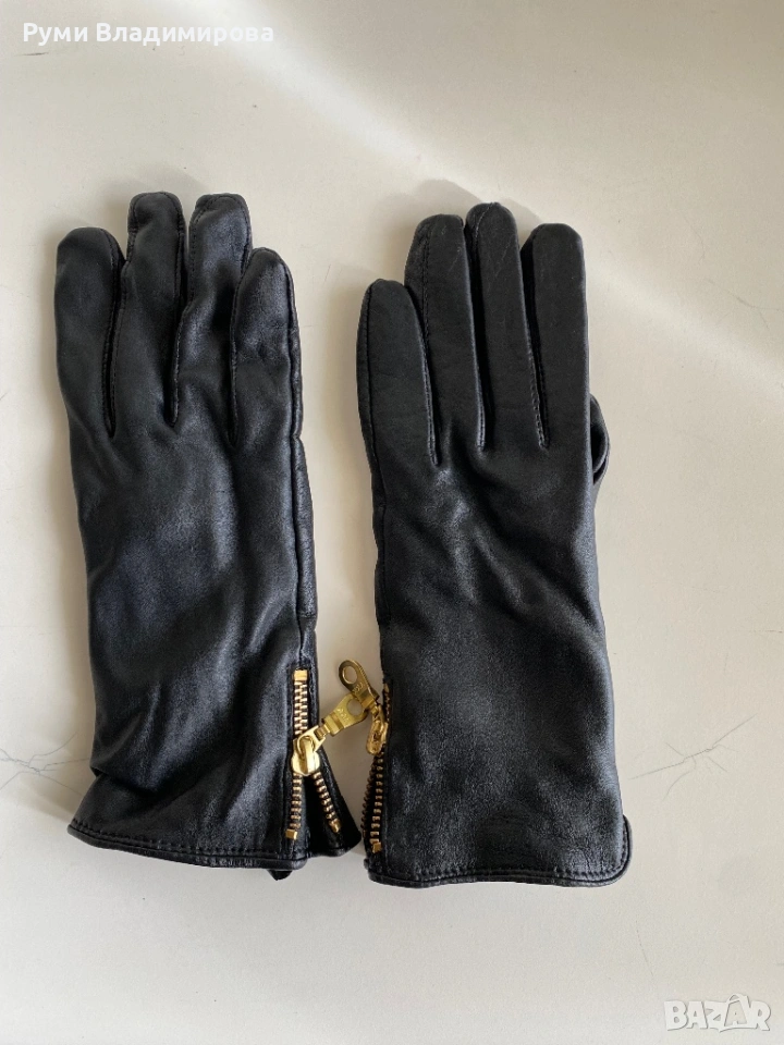 Черни Ръкавици от естествена, агнешка кожа, размер L/ 7,5, с подплата,, с акцент златист цип встрани и на двете ръкавици, доставка с Еконт.