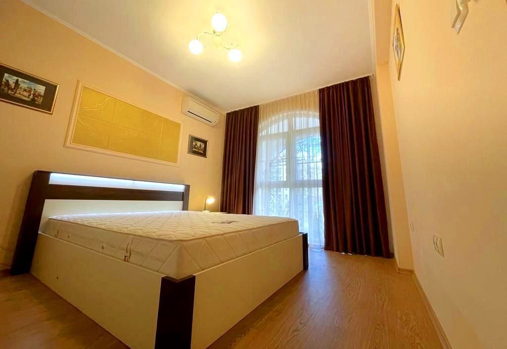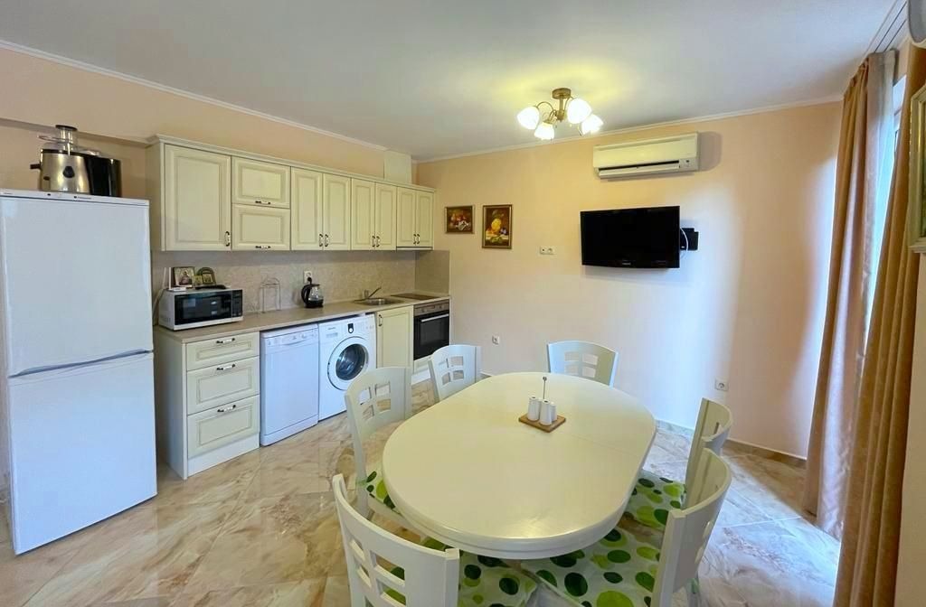 площ от 120 кв.м. функционално разпределена на две нива, като на първи етаж - просторна и светла дневна /камина/ с трапезария и кухня, излаз на веранда и малък двор /15 кв.м./ част от красиво озеленената територия на комплекса със зона за барбекю и релакс, банs с wc, входно антре. Втори етаж - две спални, баня с wc, коридор, тераса с гледка към басейна. Напълно обзаведено и оборудвано с нови мебели и техника висок клас, топъл под в цялото жилище.