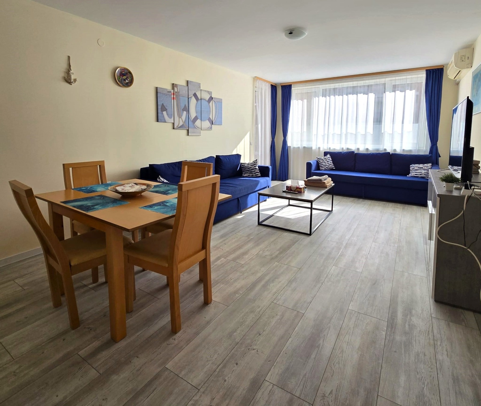 Марина Реал, предлага за продажба двустаен апартамент в красивата част между гр.Свети Влас и Елените, в подножието на източните склонове на Стара планина и разкошната плажна ивица. Жилището е комплекс с голяма територия, разположен на първа линия. Нова сграда, втори етаж /асансьор/, площ от 71 кв.м. и разпределение - просторна и светла дневна с трапезария и кухня, спалня, баня с wc, коридор, тераса с прекрасна гледка към морето и територията на комплекса. Напълно обзаведено и оборудвано с мебели и техника. Изложение - изток. Апартаментът е в комплекс Панорама Форт Бийч , с красиво озеленена територия, басейни, ресторант, бар, фитнес център, охрана, паркинг. Годишна такса поддръжка - 1086 евро. Имотът е подходящ за постоянно живеене, летуване и отдаване под наем!!! Отлично инвестиционно предложение!!!
