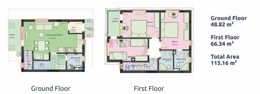 Марина Реал, предлага за продажба двуетажна нова къща - тип таунхаус, на тихо и спокойно място в гр. Поморие, м. Лахана, на самия морски бряг. Къщата е в изискан комплекс - затворен тип с А16, с площ от 115.16 кв.м. разпределена на две нива, като на първи етаж - просторна и светла дневна с трапезария и кухня, веранда с излаз към красиво озеленен собствен двор /124 кв.м./, мокро помещение, тоалетна, коридор и стълбище към второ ниво. Втори етаж - три спални, едната със самостоятелна баня с wc, баня с wc, коридор, тераса с прекрасна гледка към територията на комплекса и морето. Завършена на тапа - положени ел. кабели, оптични със слаботокова инсталация, която позволява внедряване на софтуер с възможност за дистанционно управление от типа Умна къща . Изложение - изток/запад. Имот подходящ за постоянно живеене, летуване и отдаване под наем!!!