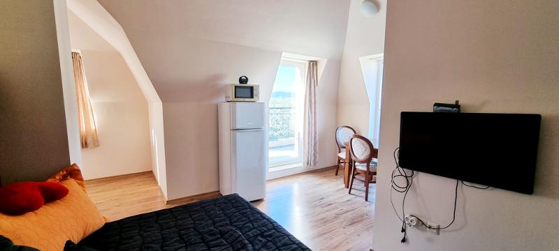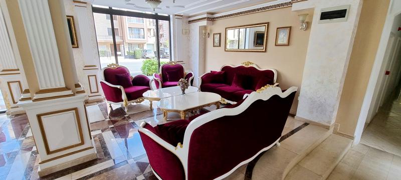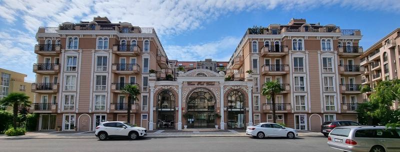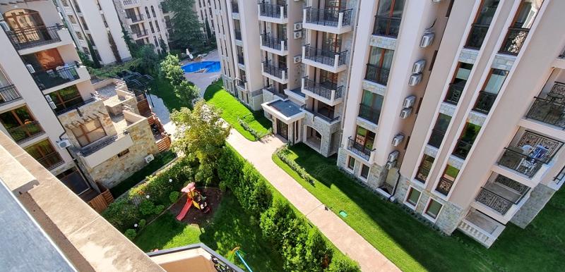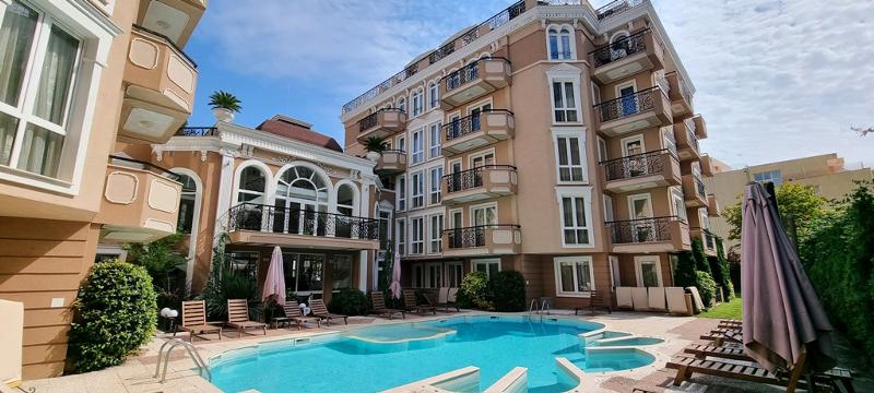 КЛЮЧ В АГЕНЦИЯТА!!! Двустаен апартамент на тихо и спокойно място в к.к. Слънчев бряг, на 10 мин. от центъра на комплекса и плажа. Жилището е в нова сграда с елегантна класическа архитектура, на пети етаж /асансьор/, с площ от 87.23 кв.м. и разпределение - две дневни с кухня - трапезария и два обособени спални къта, две бани с wc, коридор, две тераси с прекрасна гледка към територията на комплекса. Напълно обзаведено и оборудвано с нови мебели и техника. Изложение - запад. За строителството и довършителните работи са използвани материали висок клас. Красиво и богато озеленена територия, басейн, възможност за паркиране. Имотът е подходящ за постоянно живеене, летуване и отдаване под наем!!!