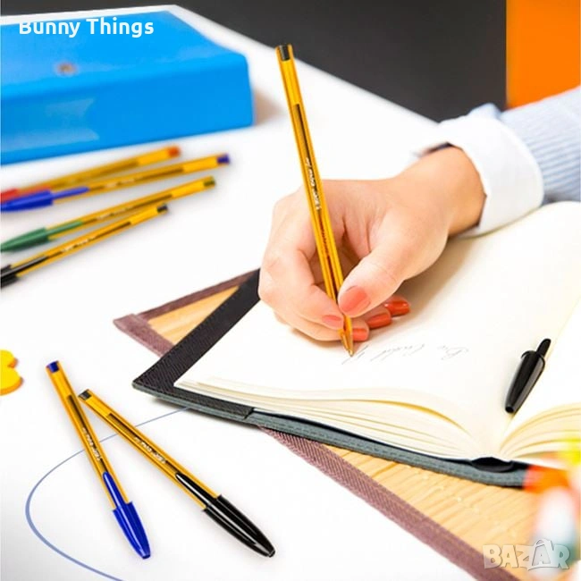 BIC химикалка с мек връх 0.8 мм, позволяващ фино писане. Опаковката съдържа 4 бр химикалки със синьо мастило и жълто тяло.