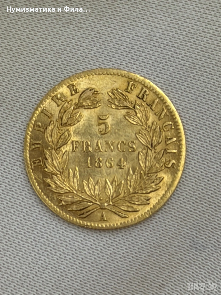 Златна монета 5 франка 1864 година, снимка 1 - Нумизматика и бонистика - 53409999 Златна монета 5 франка 1864 година, снимка 2 - Нумизматика и бонистика - 53409999 Златна монета 5 франка 1864 година, снимка 3 - Нумизматика и бонистика - 53409999 1/3
