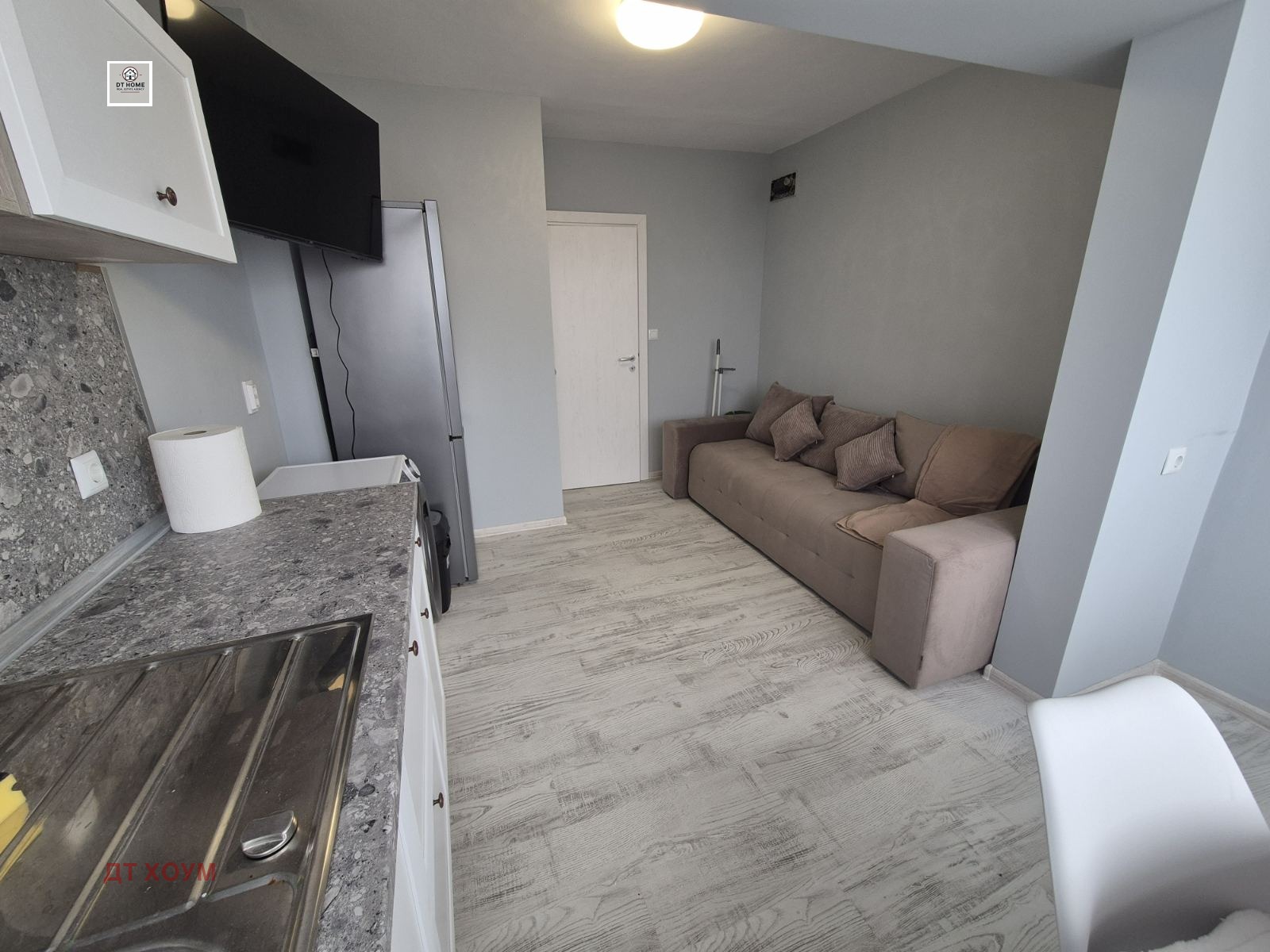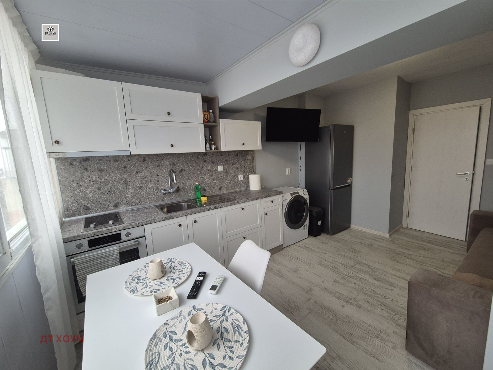 Кухня с всекидневна която е оборудвана с всички необходими ел. уреди като фурна, хладилник, аспиратор, котлони, пералня със сушилня и климатик. Голям много удобен, луксозен разтегателен диван. Подовата настилка от висок клас ламинат, висок клас дограма и висок клас мебели, телевизор поставени в частта на всекидневната. Луксозна тераса на която се излиза от всекидневната.