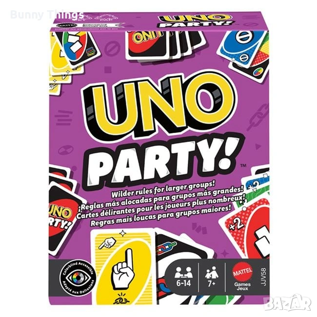 За 6 до 14 играчи на възраст над 7 години, „UNO Party“ обещава много забавление за семейства и приятели на партита и игрални вечери!