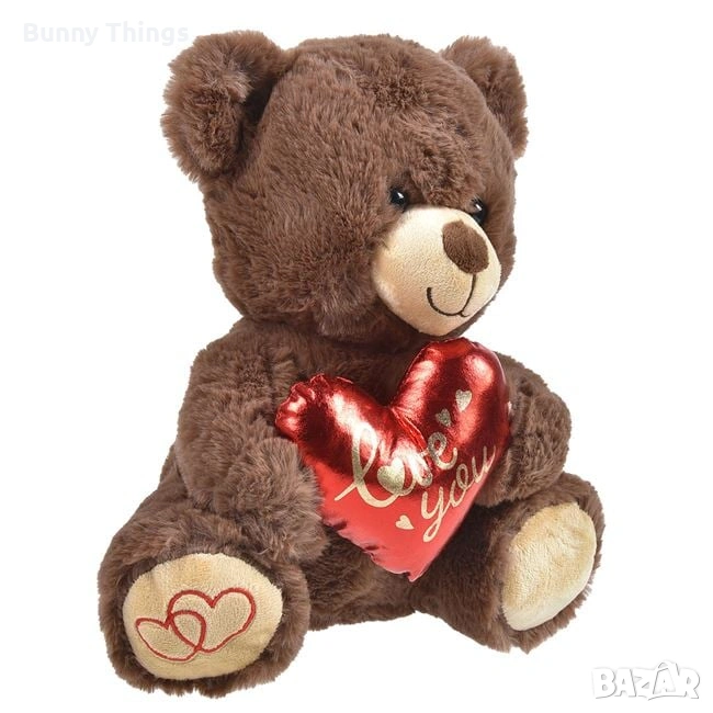 Кафяво плюшено мече с червено сърце, на което пише "LOVE" и сърце на едната лапичка.