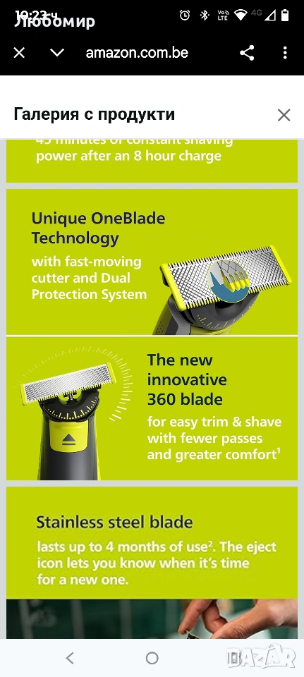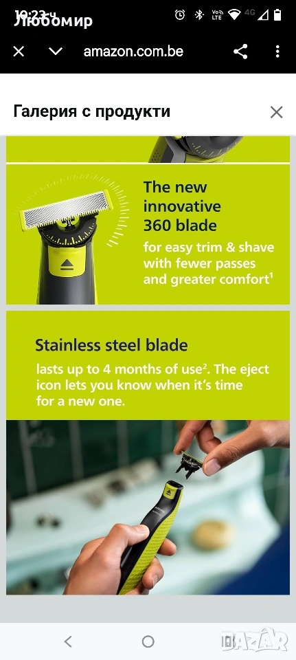 Иновативно 360-градусово острие: върти се във всички посоки за постоянен контрол и контакт с кожата; лесно подстригване и бръснене на труднодостъпни зони с по-малко движения и повече комфорт¹