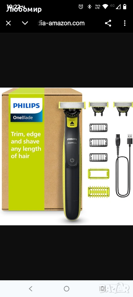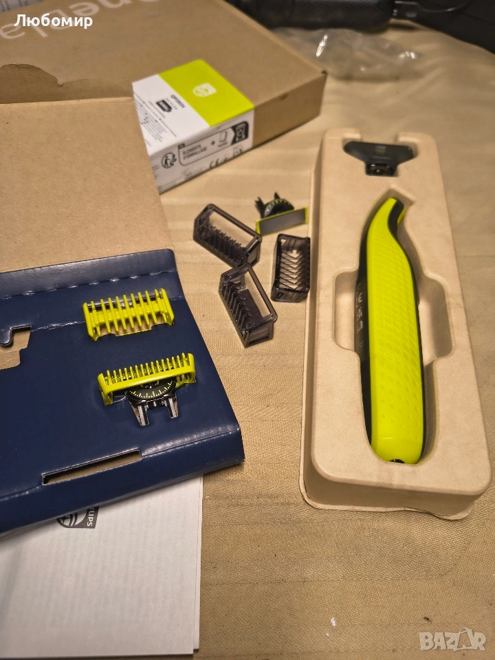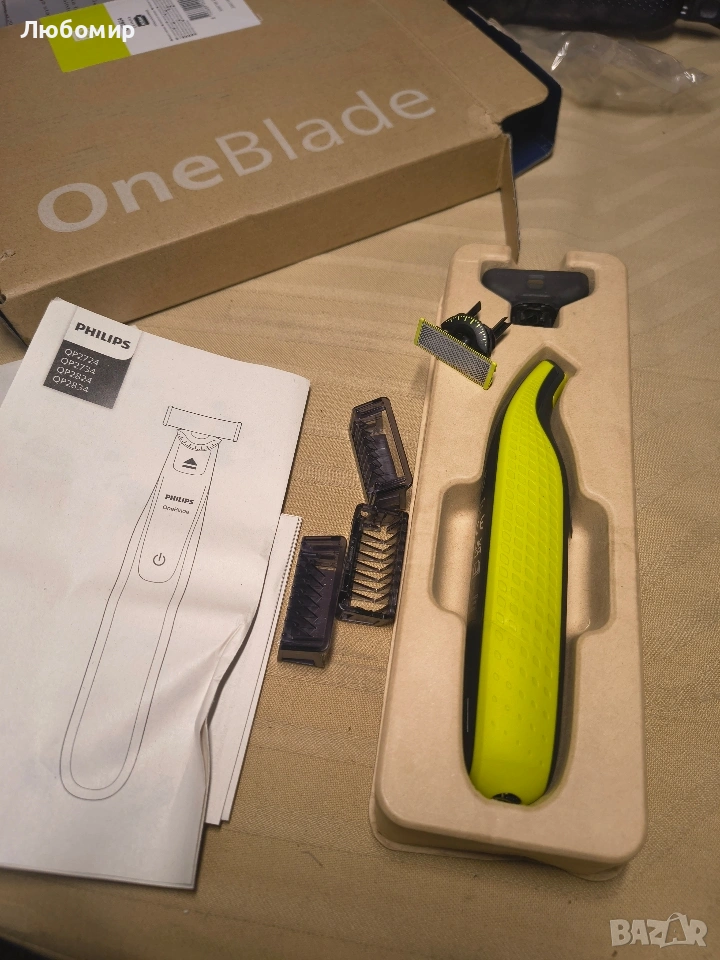 Комплектът включва: 1x Philips OneBlade 360 за лице и тяло, 3x 360 ножчета, 3x гребен за брада (1,3,5 инча), 1 x комплект за тяло (1 x гребен за тяло с щракване и 1 x защита за кожата), 1 x защитна капачка, 1 x USB-A кабел за зареждане, ръководство за потребителя