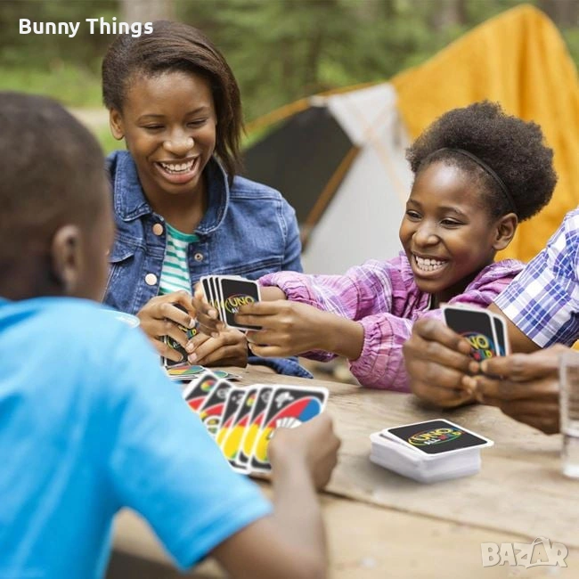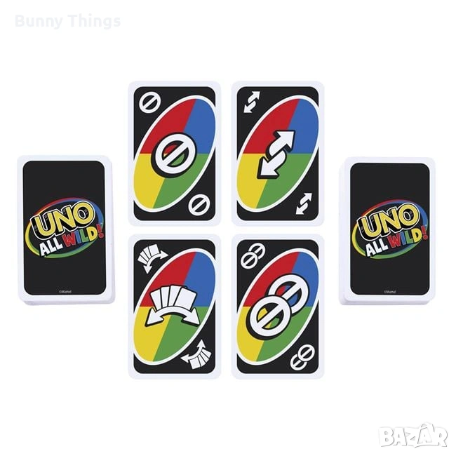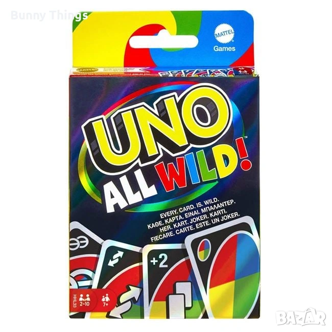 Настолна игра “UNO All Wild“. В играта с карти “UNO All Wild“ всяка карта е жокер за бърза, още по-непредвидима версия на тази любима семейна игра! Няма съвпадение на числа или цветове, както в обикновеното “UNO“, но не е толкова лесно, колкото звучи. Специалните карти за действие наистина променят играта! Има карта “Wild Skip Two“, където играчите пропускат реда на двама други играчи вместо традиционния един, карта “Wild Forced Swap“, където играчите разменят целите си ръце, и много други! Включени: 112 карти и инструкции.