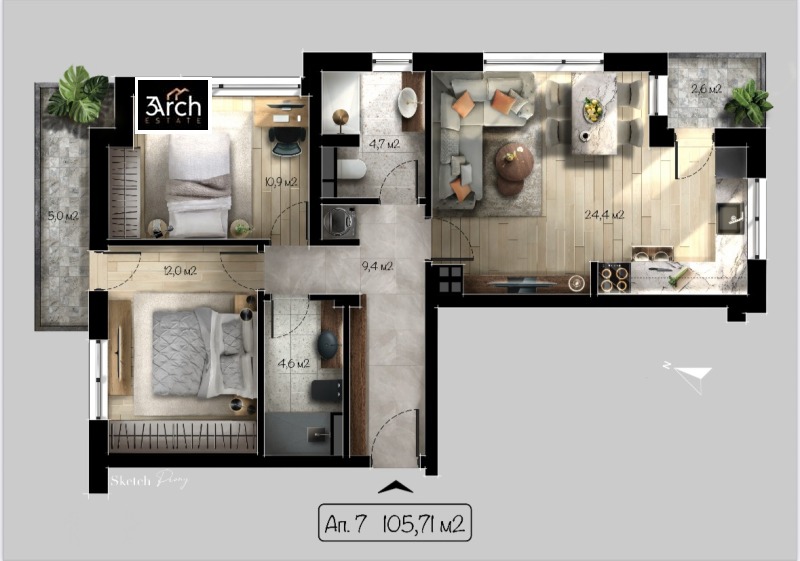 Представяме ви за продажба тристаен апартамент в новострояща се жилищна сграда, разположена в кв. Хаджи Димитър, ул. Васил Кънчев. Жилището е със застроена площ 91.1 кв.м., разпределени в : дневна с кухненски бокс- 24,4 кв.м., две спални (12 кв.м. и 10.9 кв. м.), две бани с тоалетна, коридор и две тераси.