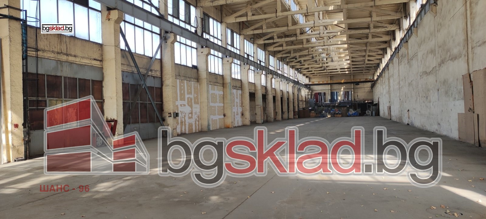 Складът се състои от: Помещение с площ 1 500 кв.м с промишлени крана 5 т.