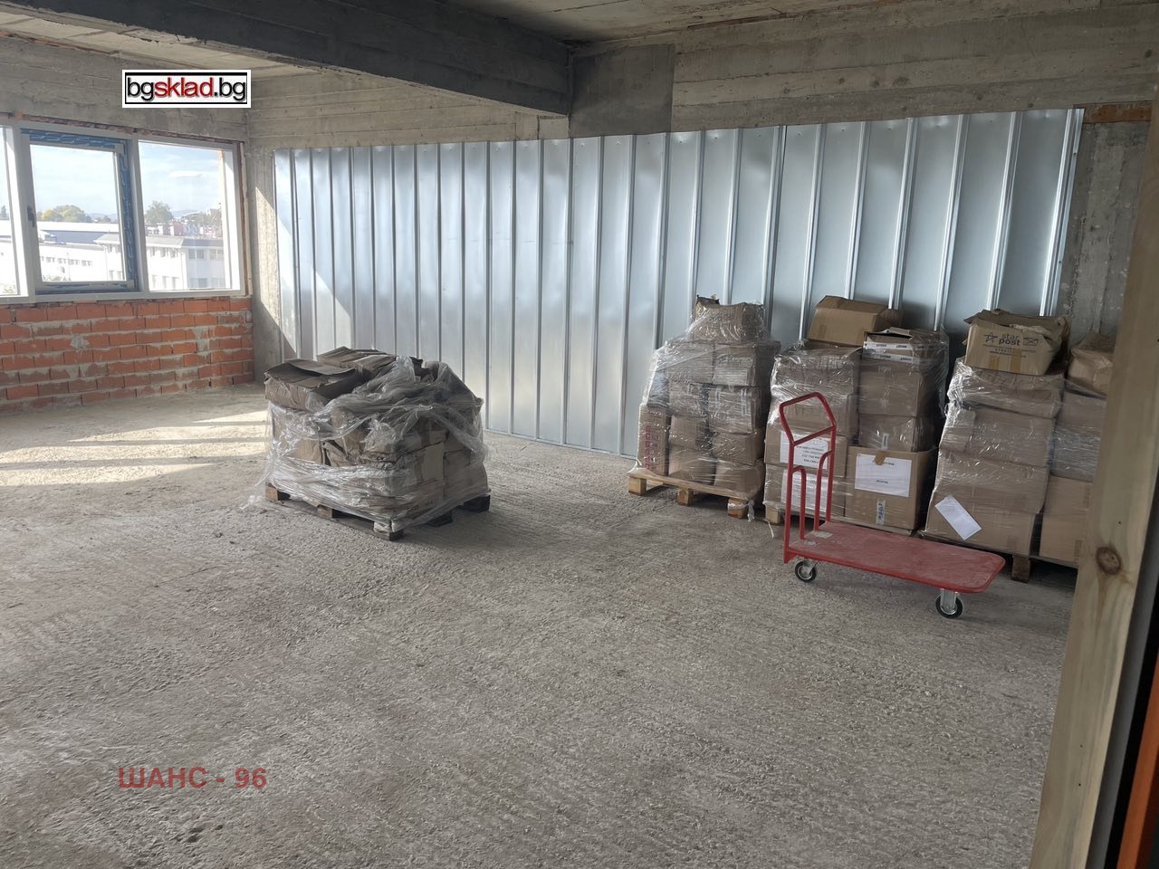 Допълнителна информация: Склада е разположен на 3-ти етаж с достъп чрез товарен асансьор. Работна височина 3 м. Стени тухла/ламарина, под и таван бетон.