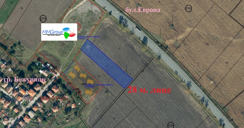 Продава парцел до регулация, до бул.Европа. Лицето на имота е 28 метра, и отстои на 68 метра от булеварда. Парцела попада в зона СМФ2 със следните параметри: плътност 40%. Имотът е подходящ за строителство и за инвестиция, тъй като е идеален за складова база, производствена база, логиситчен център, автокъща, автосервиз, хипермаркет, хранителен магазин. 0896/800-407;