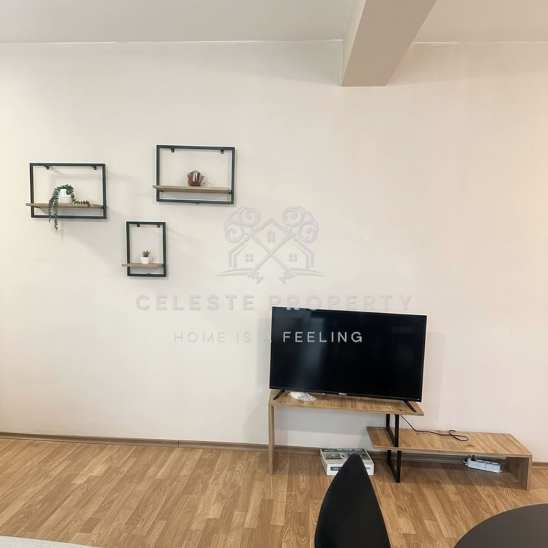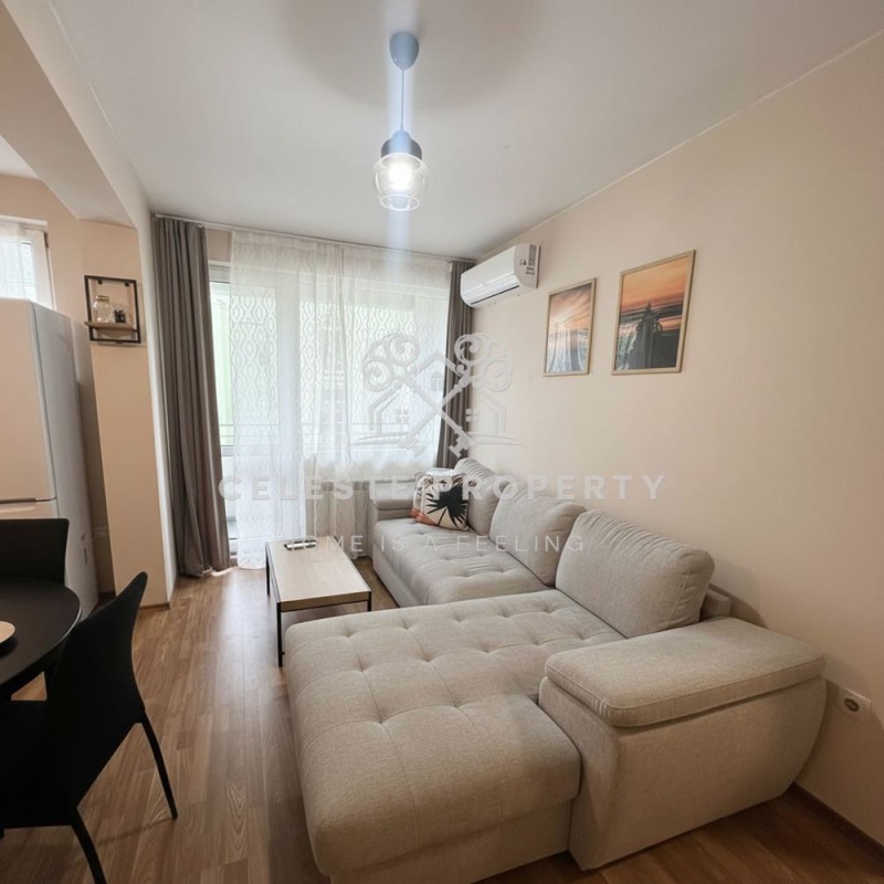 Апартаментът е стилно обзаведен и създава приятно усещане за комфорт още от входа. Просторната дневна е обединена с трапезна зона и предлага удобен диван, телевизор и много естествена светлина, благодарение на големите прозорци. Кухнята е модерно оборудвана с хладилник, пералня, плотове и достатъчно шкафове за съхранение, което я прави напълно функционална за ежедневна употреба.