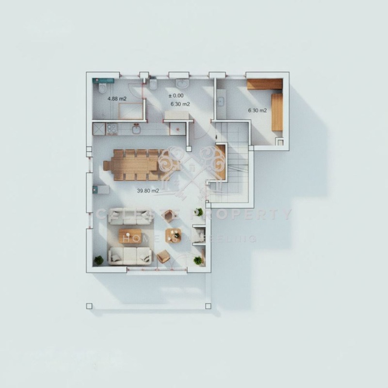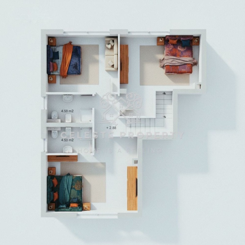 Имотът представлява самостоятелна еднофамилна къща с РЗП 181 кв.м., разпределени равномерно на два етажа, върху перфектно поддържан частен двор от 410 кв.м.
