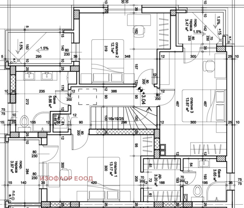 -Разпределение: 3 спални, 2 бани, дневна с кухня, перално помещение, веранда, гараж и паркомясто,помещение за съхранение.