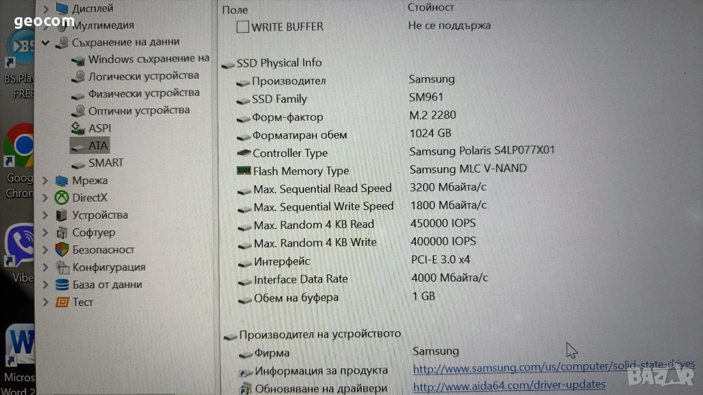 1000GB SSD Samsung SM961 M2-2280 (nVme,,PCI-Ex Gen3x4)