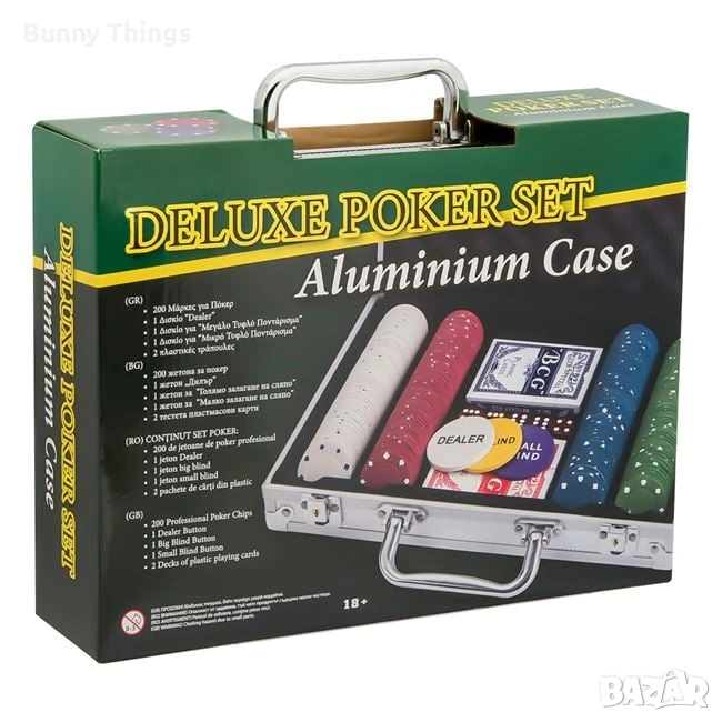 Алуминиевото куфарче включва 200 чипа за покер, 1 таблет и 1 чип за покер. "Дилър", 1 таблетка за "Голям залог на сляпо", 1 таблетка за "Малък залог на сляпо", 1 таблетка за "Малък залог на сляпо". Blind Bet" и 2 колоди карти.